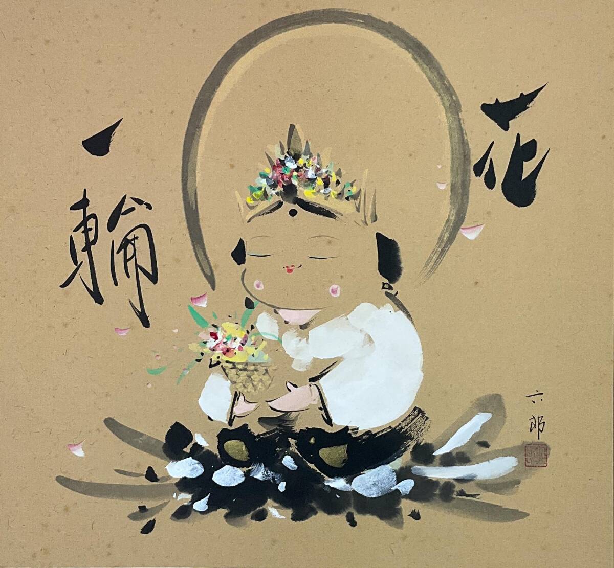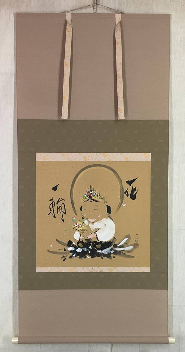 【真作】《掛軸》桐山六郎 花地蔵 共箱 日本画 彩描会 徳島