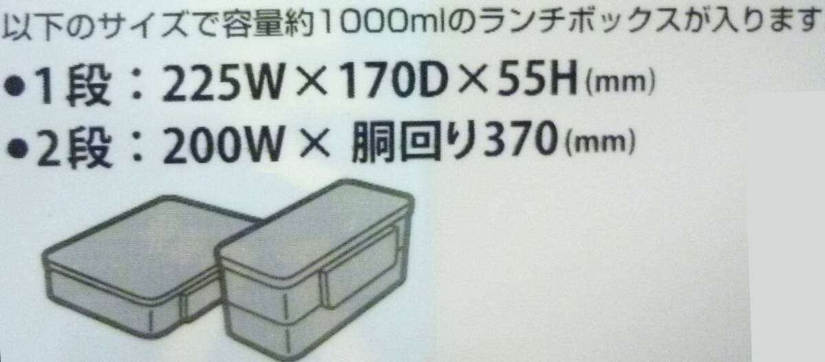 商品の説明 ●1段、2段の弁当箱どちらでも使えるランチバッグ●裏地にアルミ蒸着フィルムを使った三層構造の保温・保冷ランチバッグ。●1段、2段どちらでも使用可能。●容量(約)1000mlのランチボックスが入る。●1段:幅225×奥行170×高さ55mm 2段:幅200×胴回り370mmで使用可能。●便利なベルト付き。●サイズ(約):幅225×奥行90×高さ260mm●材質:表地/ナイロン 断熱材/発泡ポリエチレン 裏地/アルミ蒸着フィルム●中国製 より ●断熱構造でおいしさキープ!