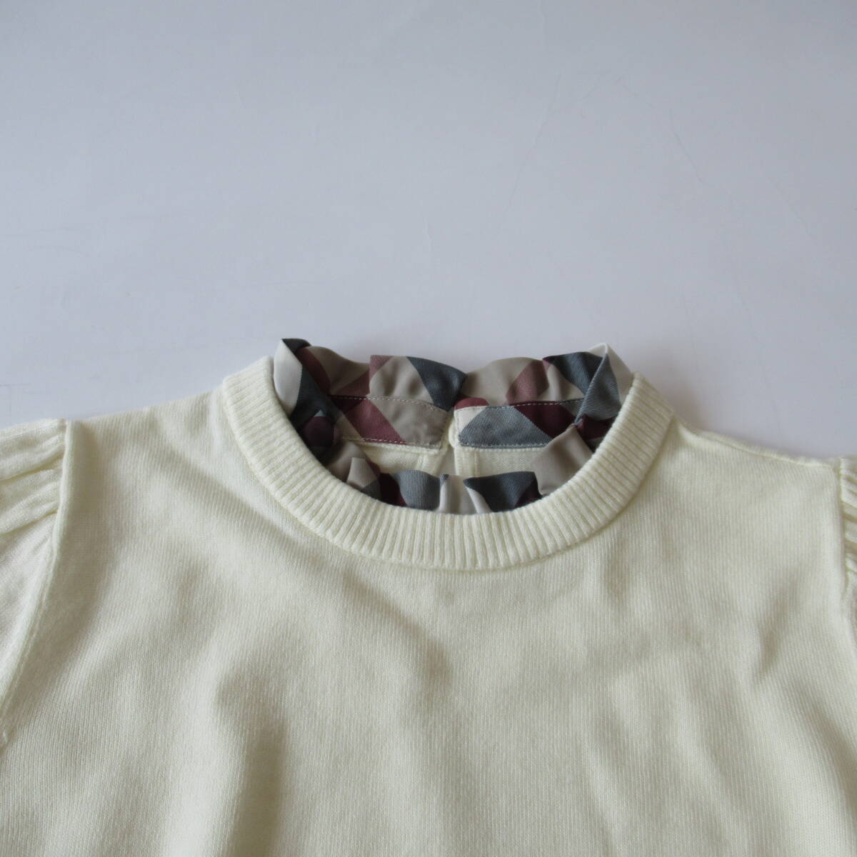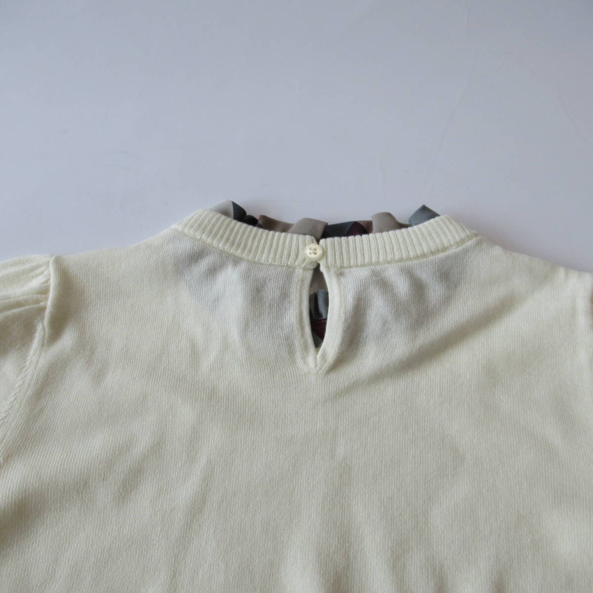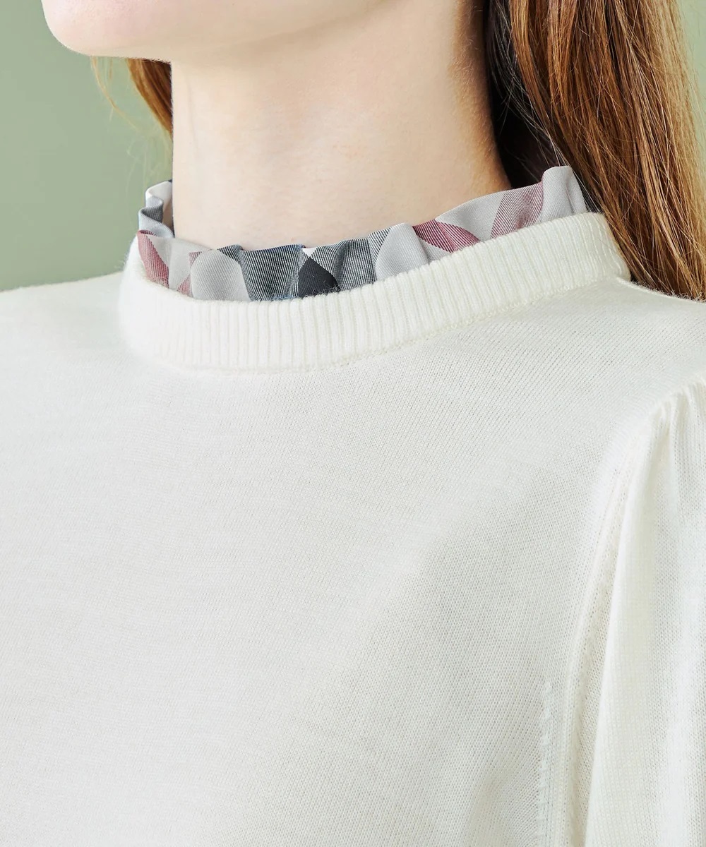 ニットとチェックブラウスをレイヤードしたようなデザインのニットプルオーバーです。首元のチェックがブルーレーベルらしいアクセントです。袖口リブを長めにとったマトンスリーブが印象的なデザインです。
