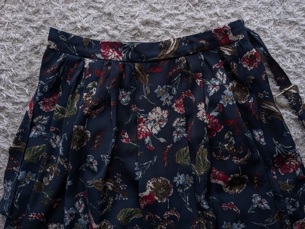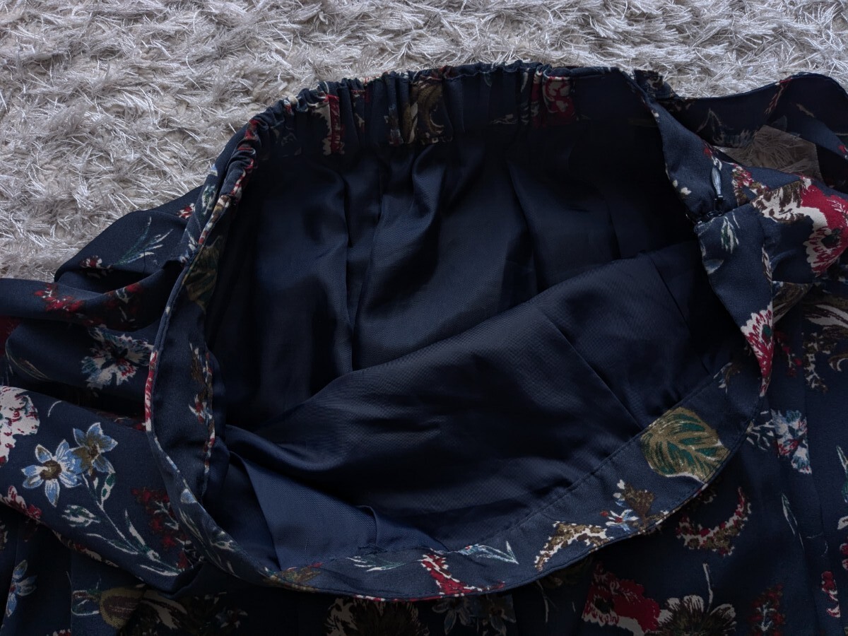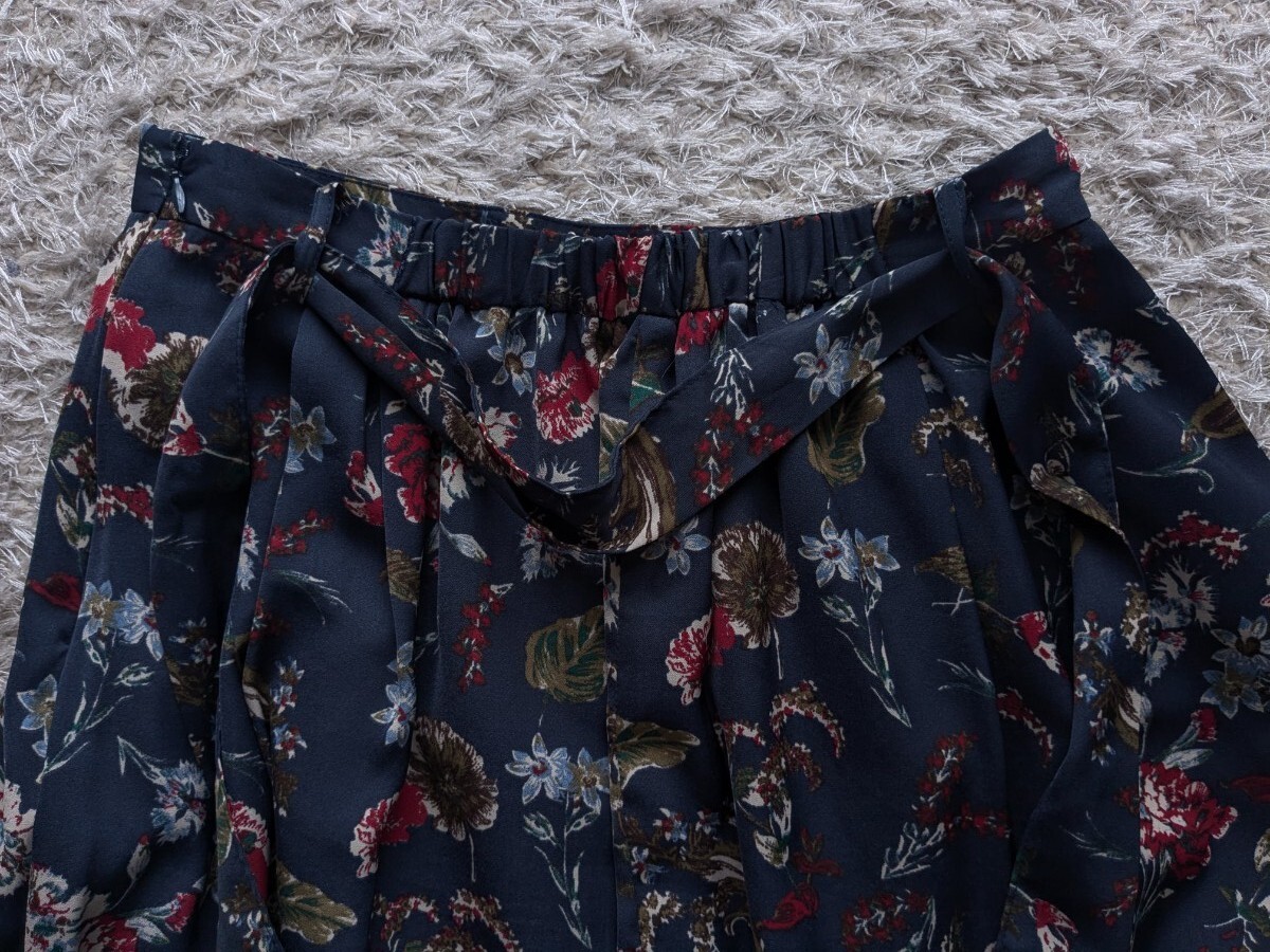 AGaquagirl ワールド 花柄プリント ネイビー 総柄デザイン華やかフェミニン ポリエステル裏地付 sizeM ウエスト一部ゴムで楽ちん 美品