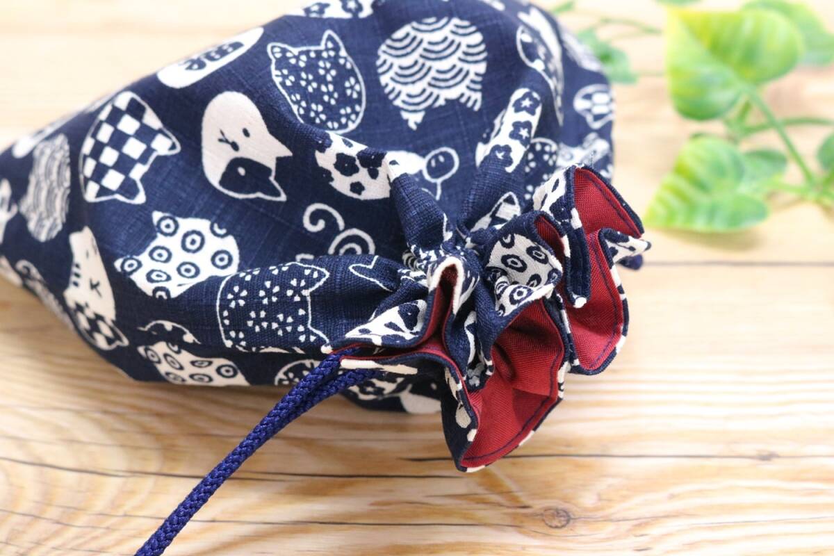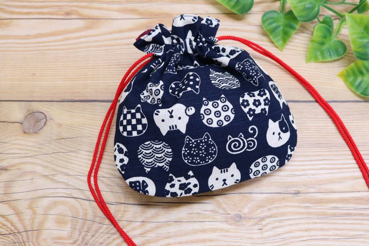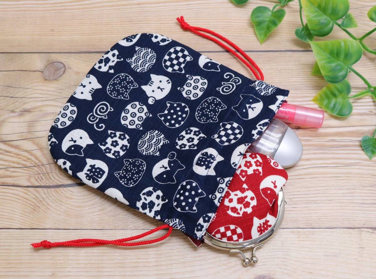 猫柄の小さいサイズの巾着袋 和風レトロな柄が可愛らしい カバンの中の小物を収納するのに便利 ミニタオルとティッシュが入るサイズ