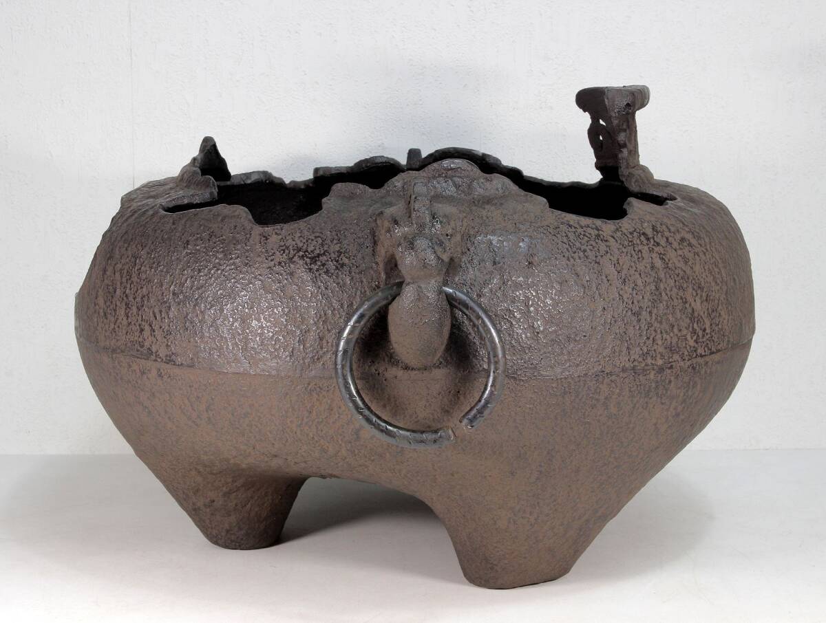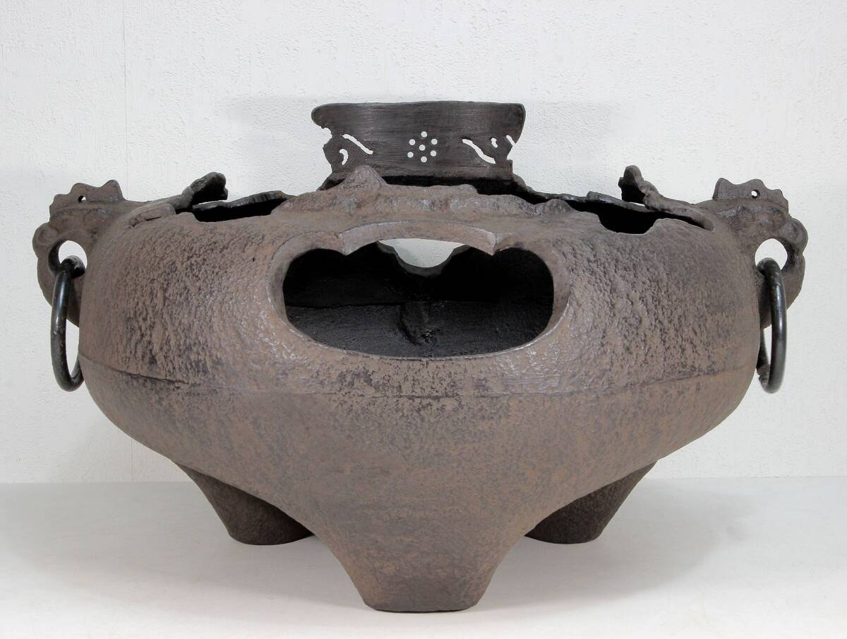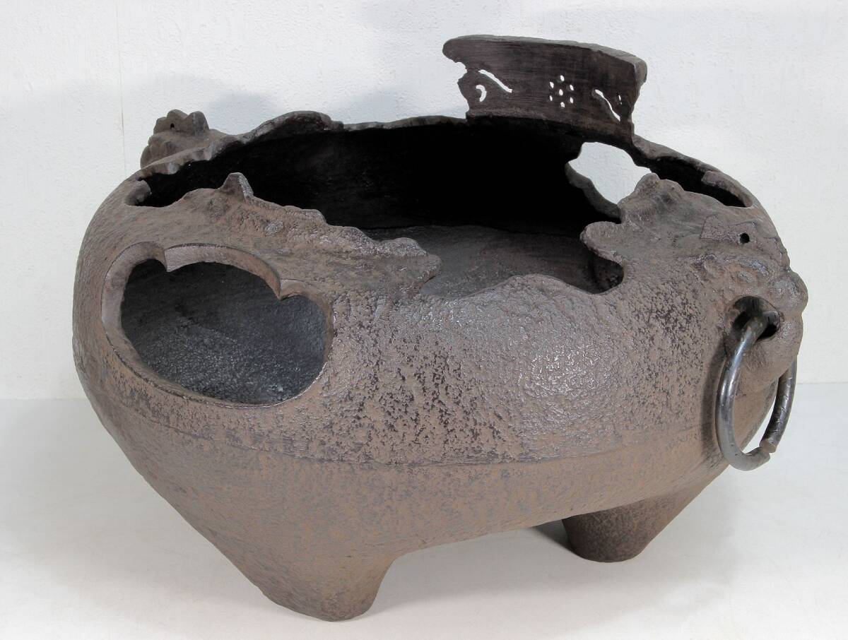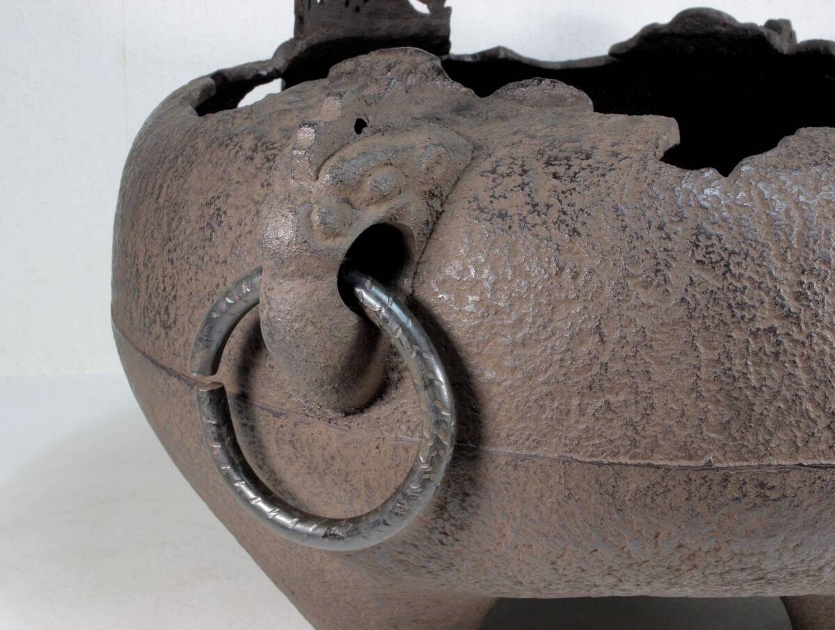 あじろ鉄 鉄製 やつれ風炉 風炉釜 獣耳遊環 破風炉 欠風炉 窶れ風炉 破れ風炉 紙箱入り 未使用品 煎茶道具 茶道 茶釜