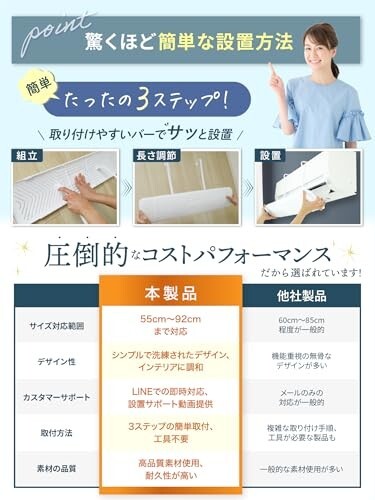 • 工事不要で簡単取付:エアコンに引っ掛けるだけ、穴あけ不要ですぐに使用可能。