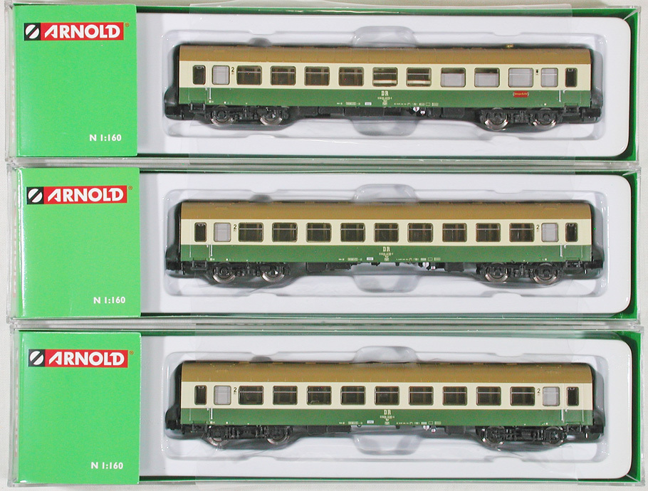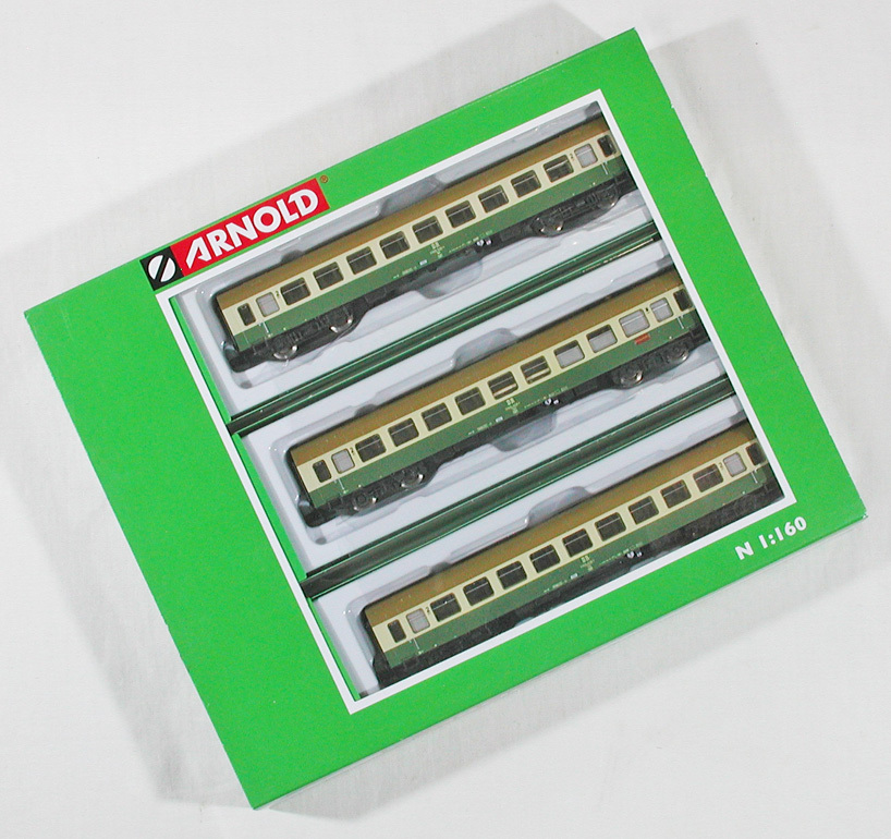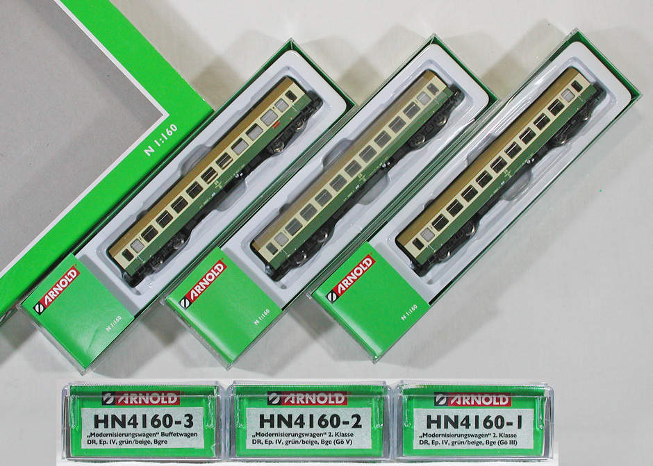 29年式リベット留め車両、36年式急行列車用車にまで拡大されました。 1960年に2等車が型式Bgeが試作され、国際列車用の税関区画が設けられた型式Dge、Dgseが製造され、1961年に最初に1/2等車の型式ABgeが納入され、続いて1等車、の型式Age、1962年にビュッフェ車の型式Bgreが納入されました。ただ、ビュッフ ェ車の量産は1964年まで行われませんでしたが、17両が製造されました。ビュッフェエリアには、3.5メートルの長さのダイニングルームと2つのスタンディングテーブル、そしてサイドボードとバーカウンターが設けられていました。近代化された車両には低圧循環蒸気暖房シス テム(Nuhz)が装備され、ほとんどの車両には電気式車内暖房用の抵抗ヒーターも搭載されていました。照明は直流発電機によって供給され、旧型台車はベルト駆動、ゲルリッツV台車はカルダンシャフト駆動で停車時はバッテリーで駆動されていました。初期には、旧式ゲルリッツIII台 車も保持されていましたが、これらはローラーベアリングに変更されました。一部の車両では、スカート付き車両のサイドスカートも保持されていました。最高速度は当初140 km/hでした。国内輸送のみに使用されていた当時は、オーバーホール間隔を延長するため、速度を120km/h まで落とすことができました。近代化シリーズ客車は、グリーン塗装の車体とグレーの屋根で登場し、直ちに国内および地域間列車に投入されました。これにより、DB(旧西ドイツ国鉄)でも運用が開始され、ベルリン~ハンブルク間の高速列車で頻繁に使用されました。1981年後 半から長距離列車向けに新しいカラーコンセプトを導入され、クロム酸化物グリーンの車体とアイボリー窓周り、フォーンブラウンの屋根と成りました。また、マルチ電圧暖房を備えた車両は国際的に広く適用可能でした。近代化客車シリーズ客車で構成される国内急行列車では、2両ま たは3両の1等車、または1/2等車が列車の中央、食堂車の前後に配置されていました。その後UIC-Y車輌の導入、UIC-Z車輌のが導入された後は近代化シリーズ客車は主に急行列車で使用されるようになりました。1990年代までには、二次サービスでのみ使用されるように なりました。 このモデルは、新しいカラーコンセプトを導入され、クロム酸化物グリーンの車体とアイボリー窓周り、フォーンブラウンの屋根と成ったコンピュータ番号表記での1980年代の装いとなってます。 この商品は、3両セット2組で形成されますが、1等車を含むセットが完売し、本セットのみでの販売とさせていただきます。 塗装、ディテール共に最近の中国製としての標準レベルで良く出来ています。中国生産製品の常で、1ロット生産で、在庫切れで絶版となるスタイルで既に絶版となってます。ただ、違うカタログ番号での再生産が行われることはあります。 |