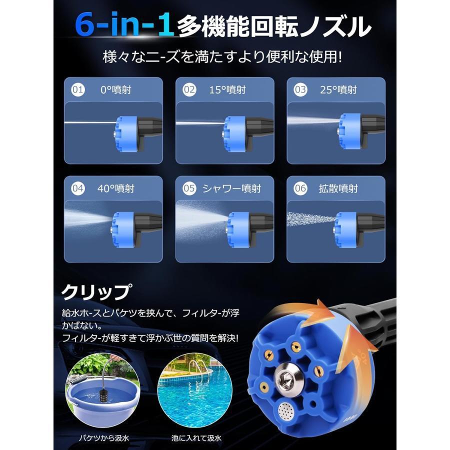 3. 6合1多機能ノズル: 0°/15°/25°/40°/拡散モード/シャワーモードの6種類の噴射モードを搭載。洗車から窓ガラス掃除、園芸まで多用途に対応します。