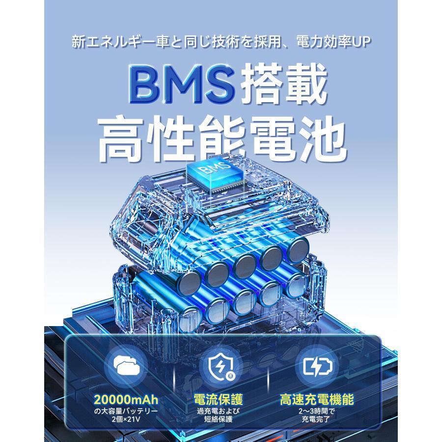 4. 大容量バッテリー&残量表示: 2つの20000mAhバッテリーで連続使用60分以上。急速充電技術で2〜3時間で満充電。過充電・過放電・短絡保護機能付きで安心して使用可能。