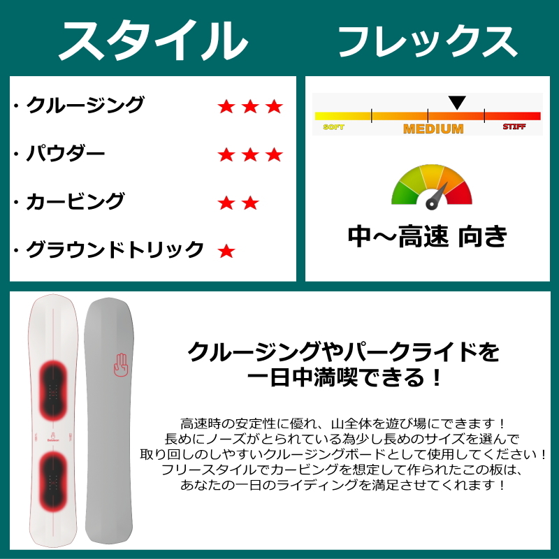 テールが硬めの設定で、高速滑走やパウダーなどフリーライドにオススメ!