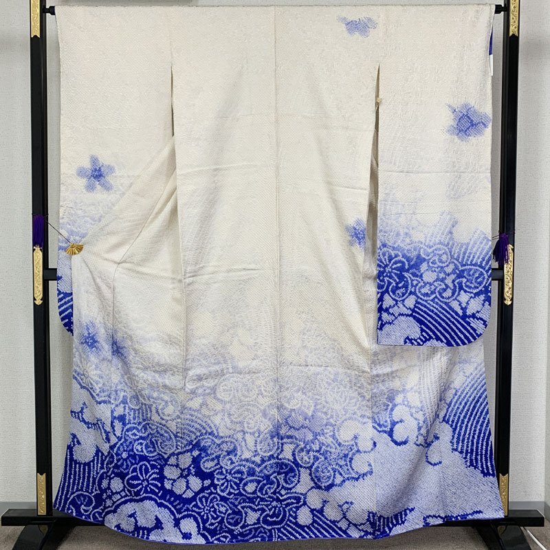 ☆中振袖 総絞り 天洋高級着物 古典柄 荒波 白×青☆しつけ付き美品 成人式 結婚式 十三参り (No.hd) オフホワイトの地に、青の荒波や梅などが絞りで染め出された総絞りの中振袖です。袖丈が短めな中振袖なので、十三参りにもおすすめです。画像4枚目右上のタグは脇付近に付いていましたが、シミの原因になると判断し破棄しました。 こちらの商品は振袖のみで、画像の袋帯507y6、重ね衿、帯締め、帯揚げは参考商品ですが、在庫がある場合に限り+17,000円で振袖とセットでお譲りすること可能です。白フリルの半衿は私物のためお譲りいたしかねます。草履バッグセット406v52は参考商品です。 画像6枚目のように、前身頃の胸~肩付近に絞りアクのような汚れ、衿に小シミと衿の裏地にシミ汚れがございます。左前身頃のものはほぼ脇なので目立ちません。衿の小シミは折った時の内側になる部分なので着用の際は見えません。ほか特筆すべきダメージはなく、しつけ糸付きの美品です。 【表地素材】正絹 【色】オフホワイト、青 *モニターによって色味は実際と異なる場合がございます。 【サイズ】