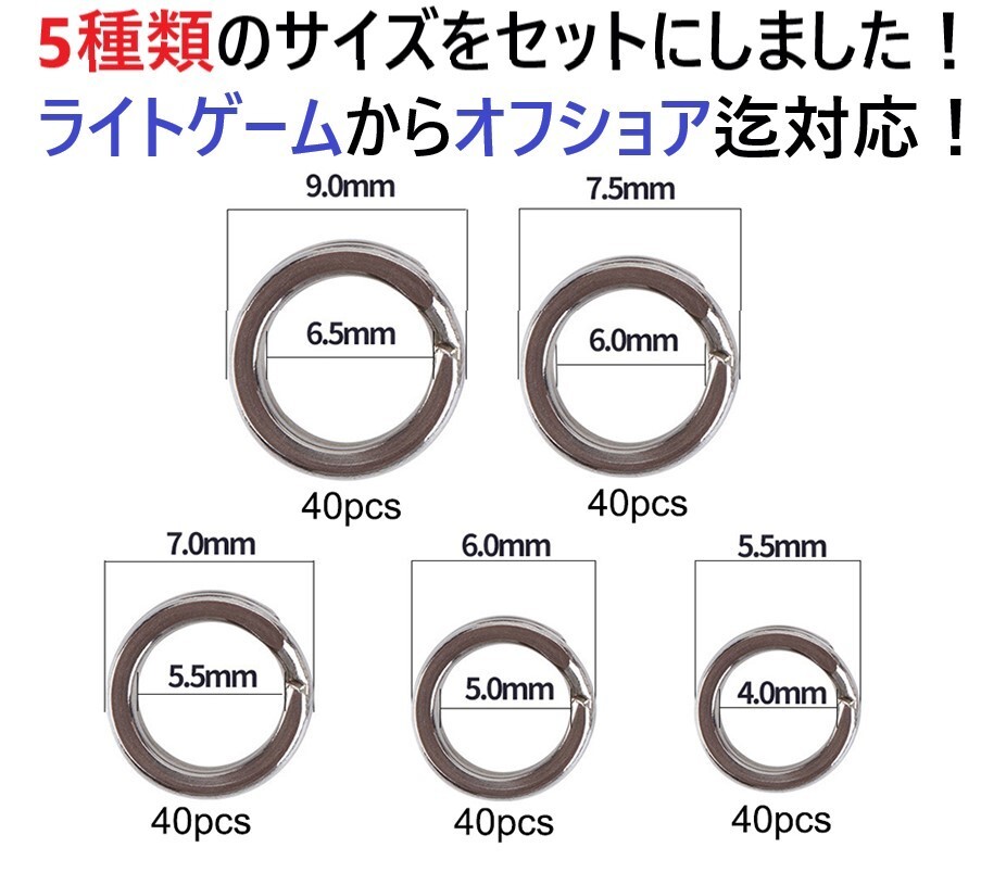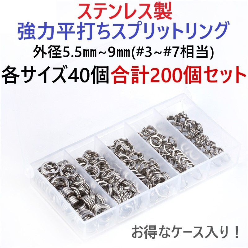 【送料無料】ステンレス製 強力平打ちスプリットリングセット #3~#7 各サイズ40個合計200個セット ケース付き