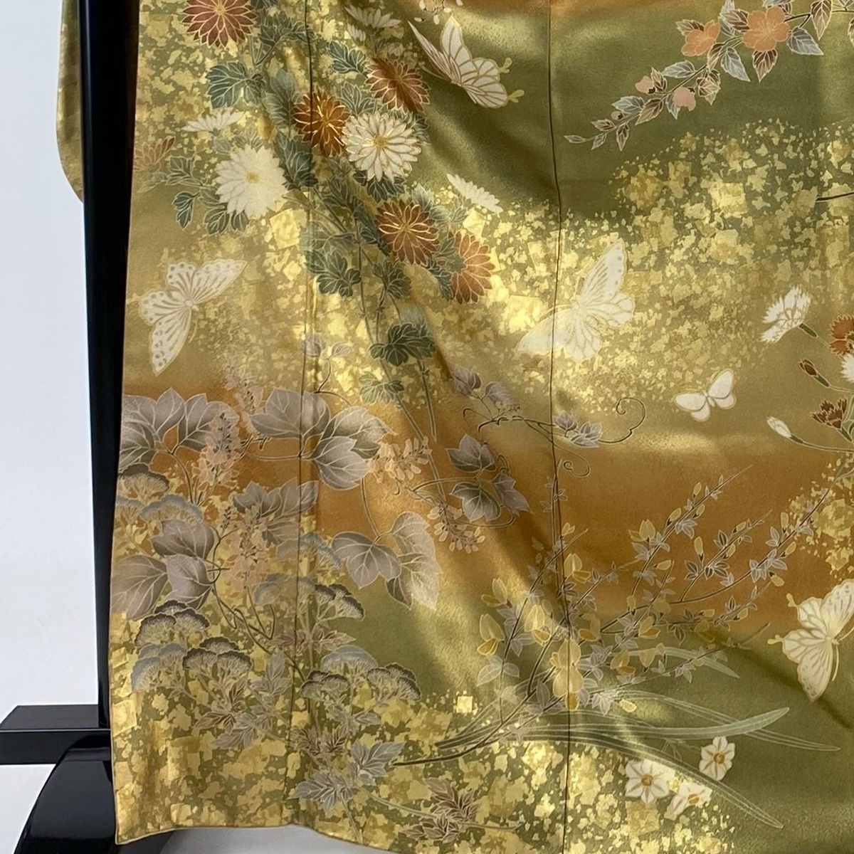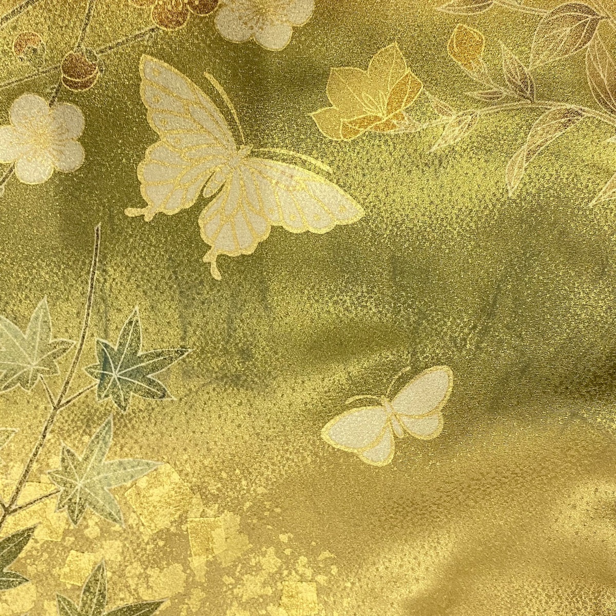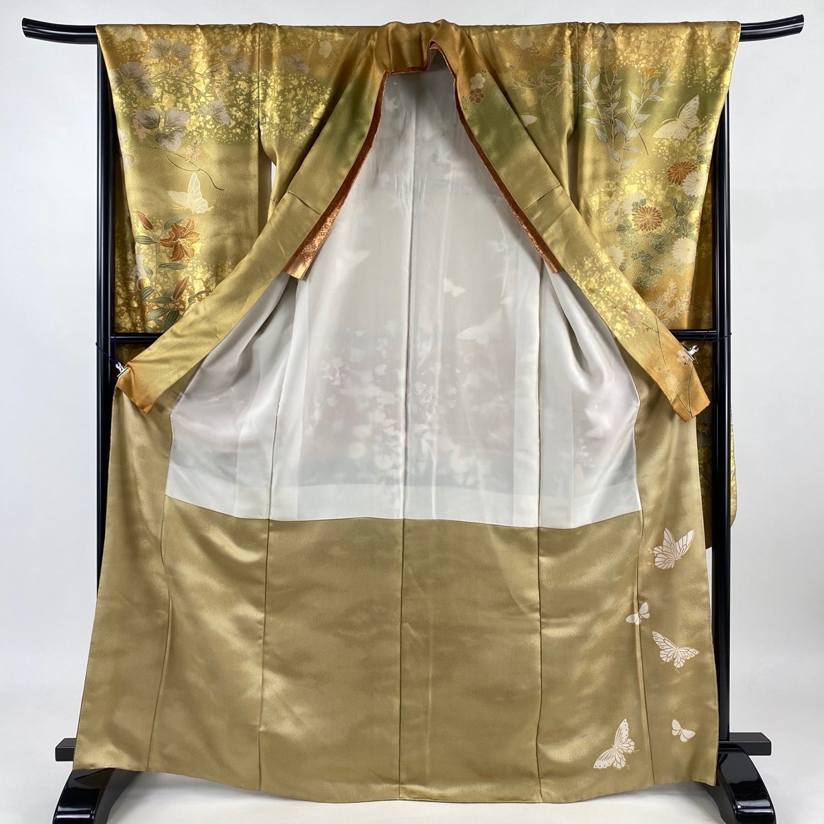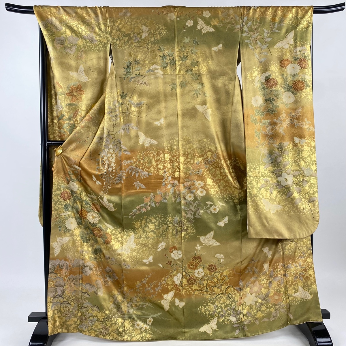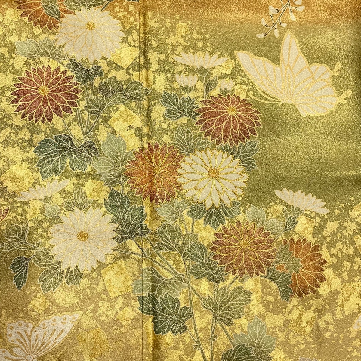 | 振袖 名品 ますいわ屋 菊 蝶 金糸 金彩 薄茶色 袷 身丈169 裄丈67.5 L 正絹 【中古】 |