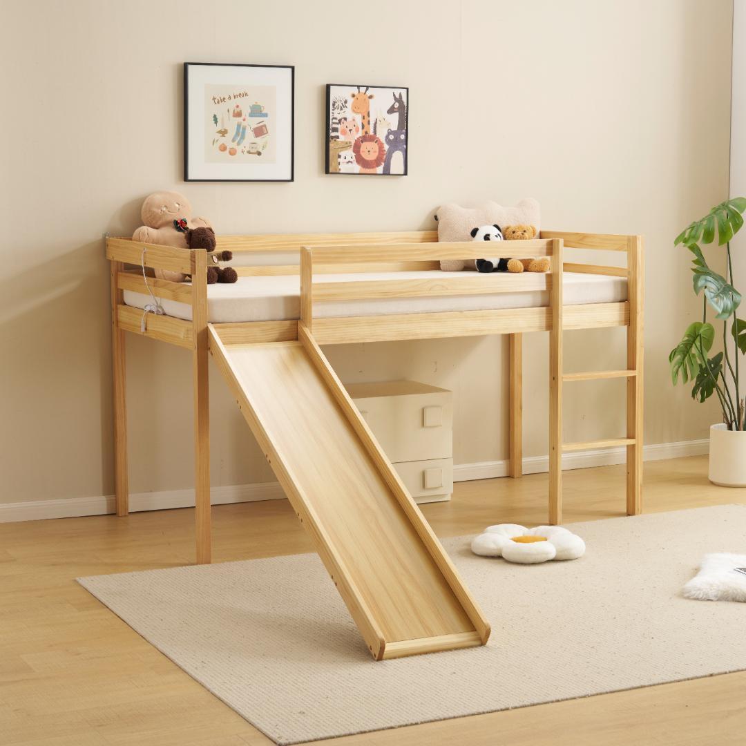 【ナチュラルな木材】天然パイン材を使用しています。滑り台とベッドボード以外、天然の松の木(クスノキ)が使われている、長期間の使用に耐える。