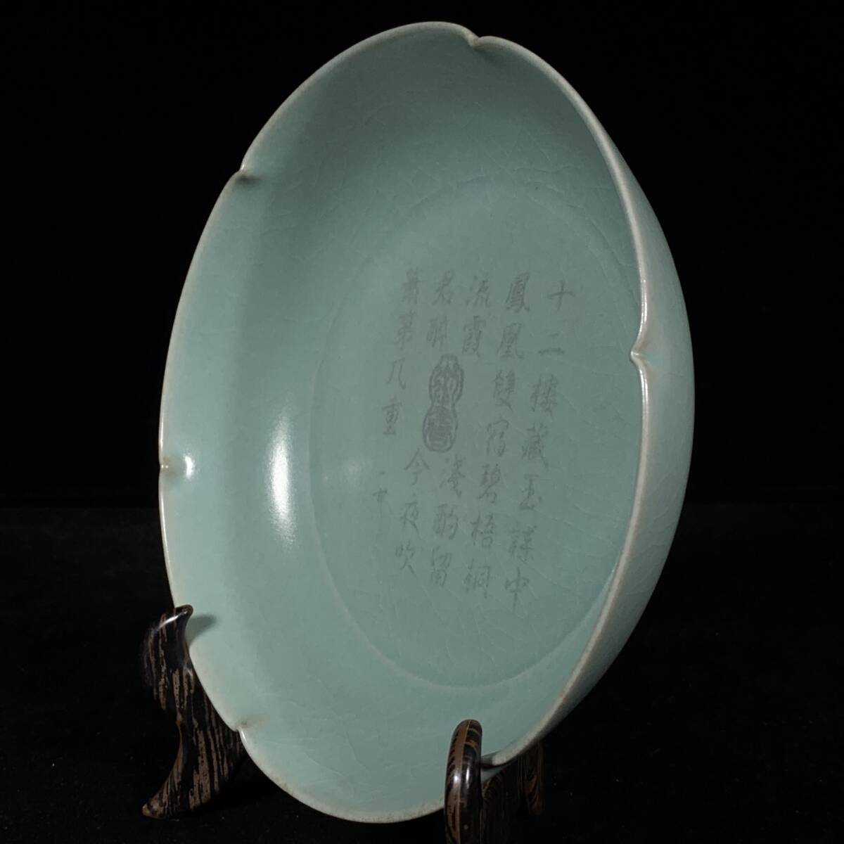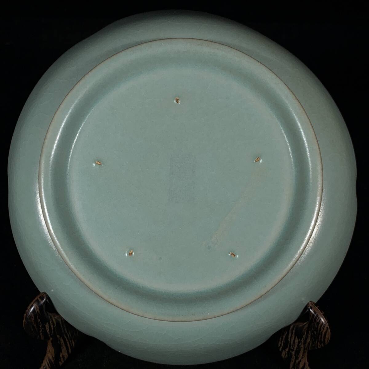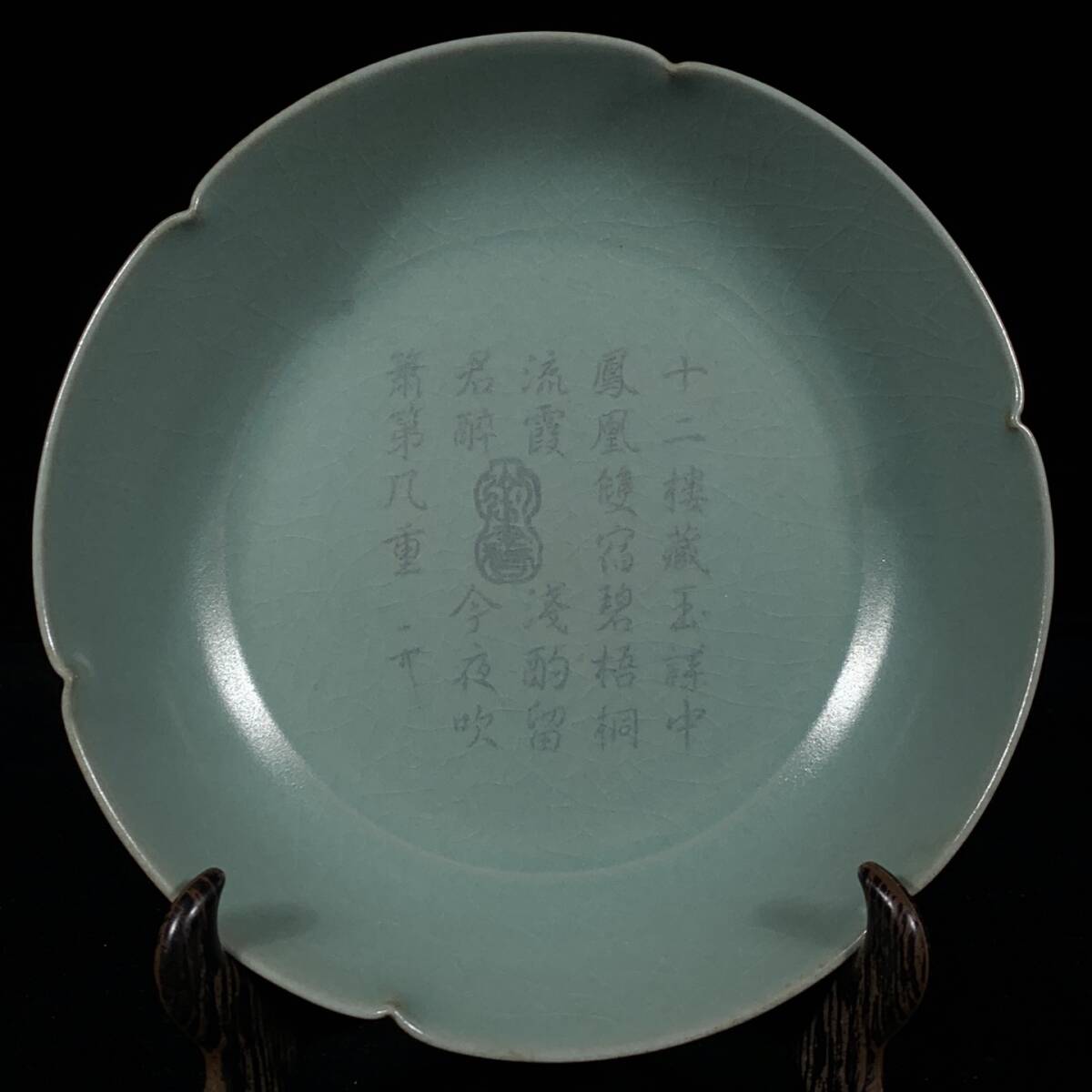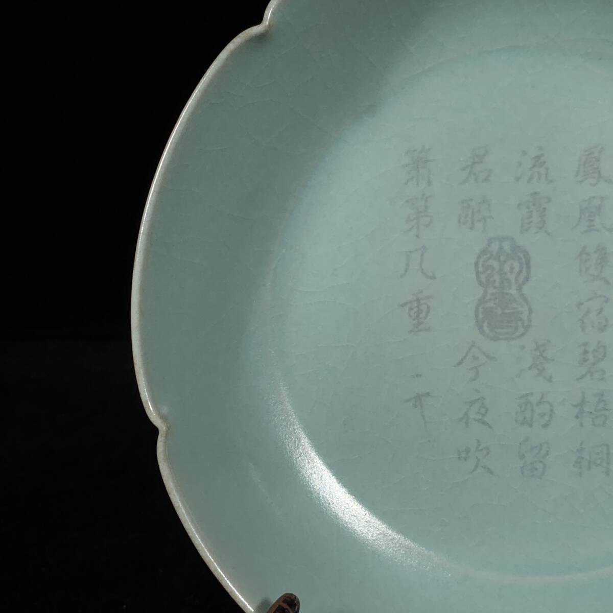 秘藏 宋時代 時代物 汝窯 天青釉銘文葵口皿 唐物 陶磁器 古賞物 置物 陶芸 中国美術 宮廷御用 高さ.5 cm 直径18.5 cm 古物保証 120.9.3