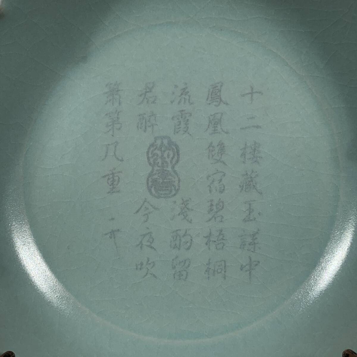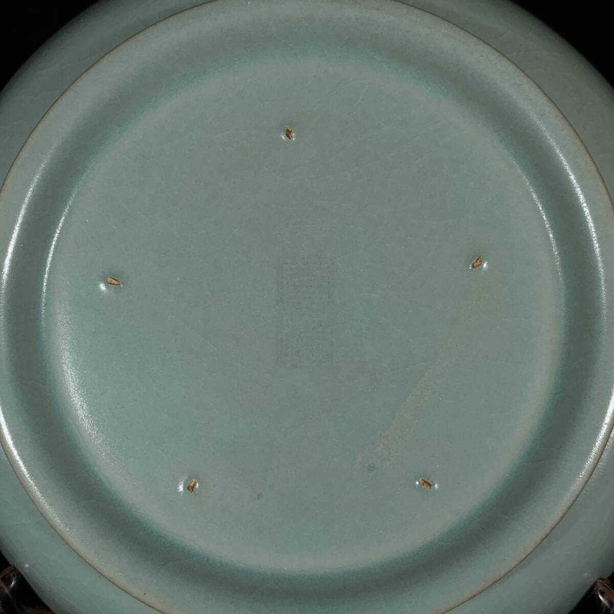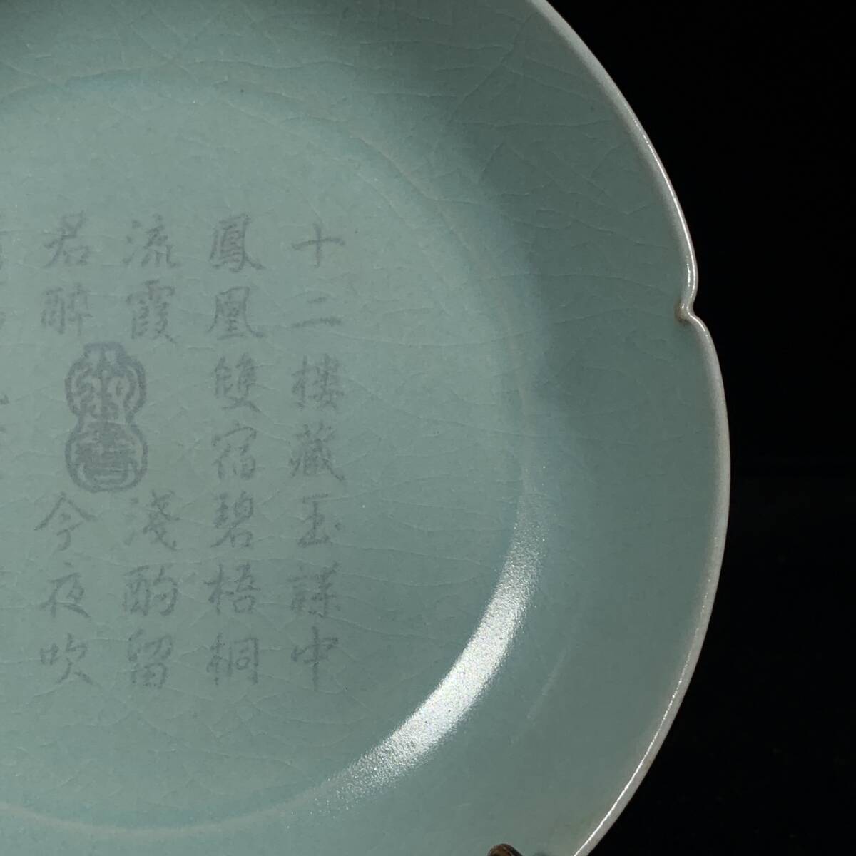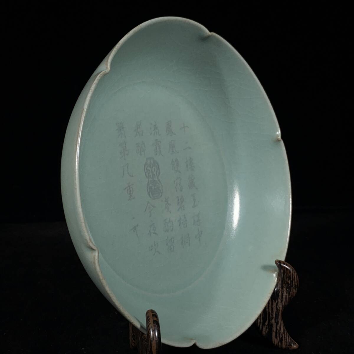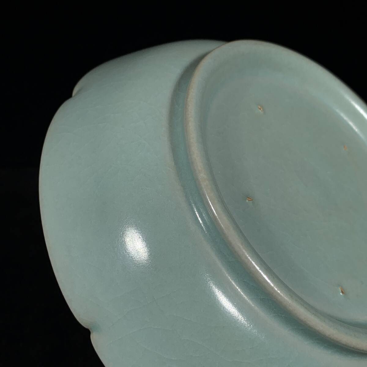 秘藏 宋時代 時代物 汝窯 天青釉銘文葵口皿 唐物 陶磁器 古賞物 置物 陶芸 中国美術 宮廷御用 高さ.5 cm 直径18.5 cm 古物保証 120.9.3