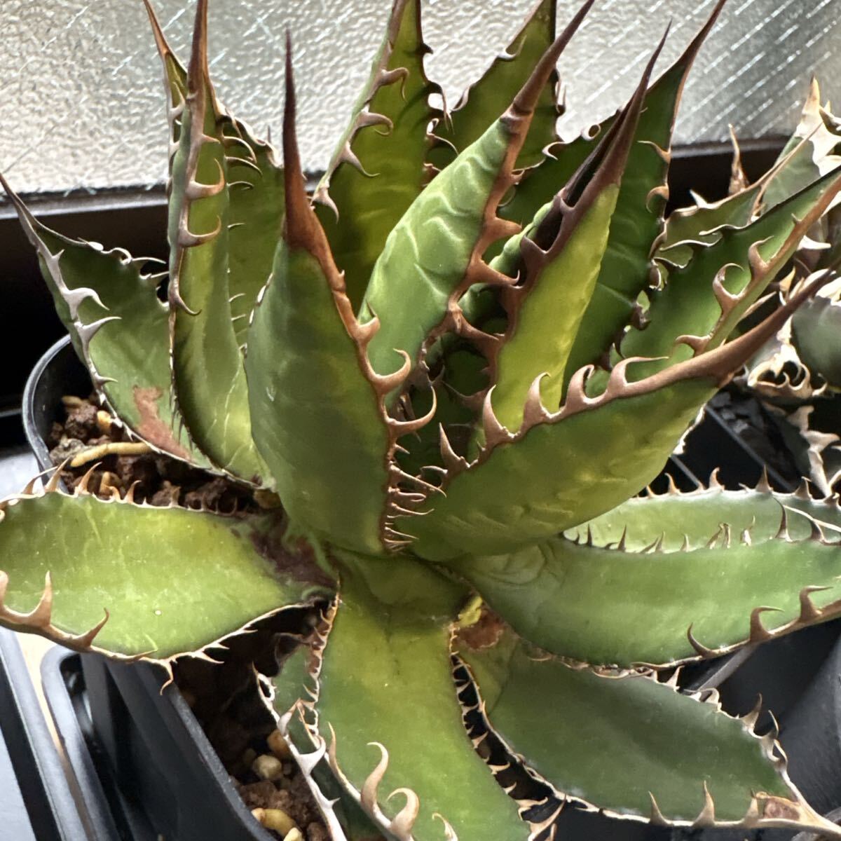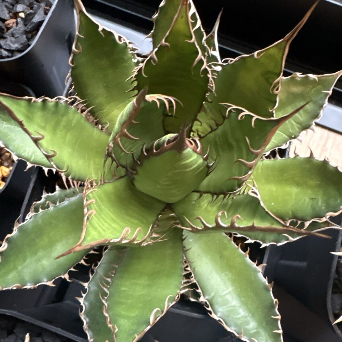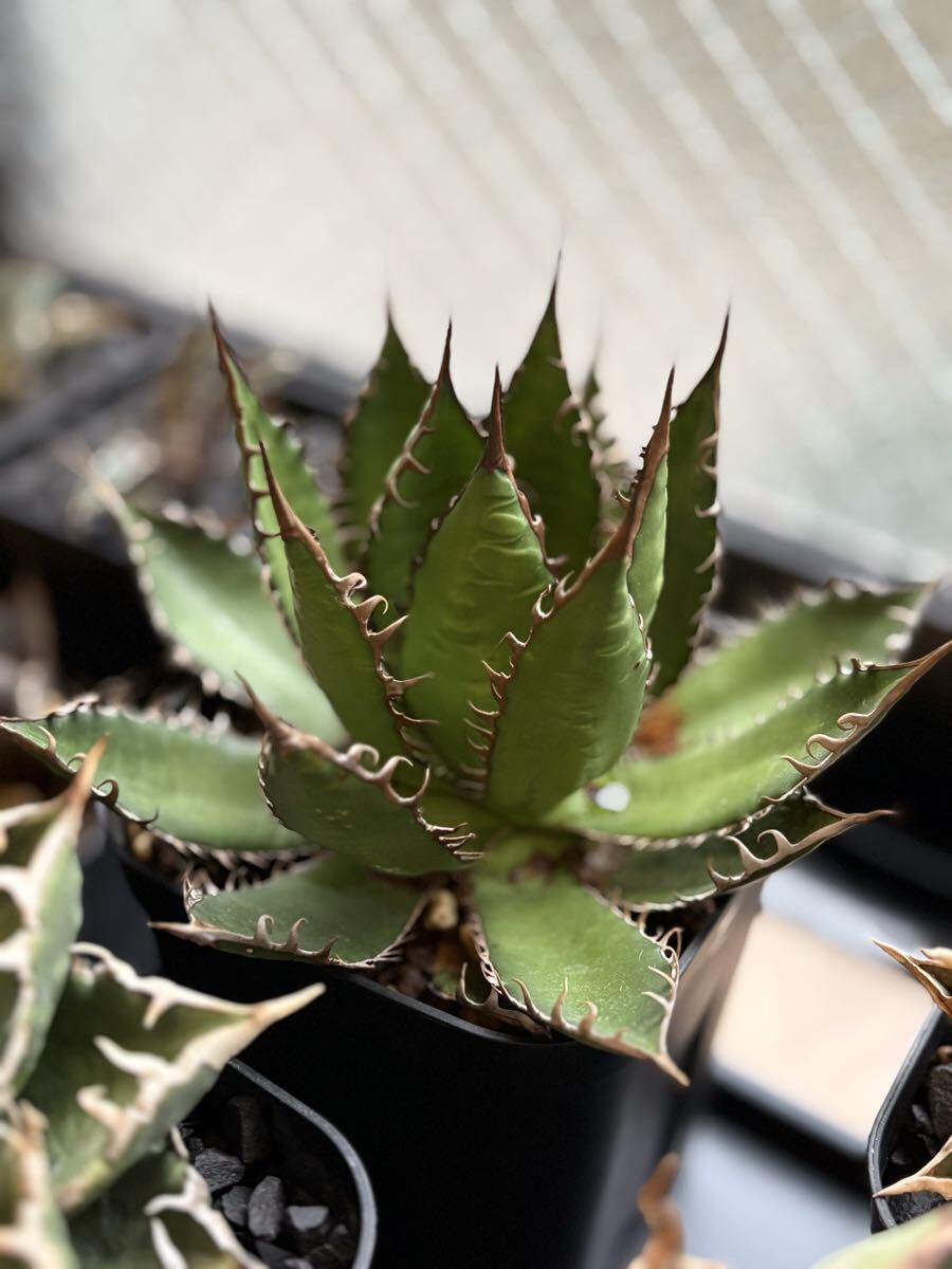 シャープな葉とアッシュグレー色の鋸歯(きょし)が特徴です。光沢のある濃緑色の葉とロゼット状の美しいフォルムが人気で、インテリアグリーンとしても適しています。