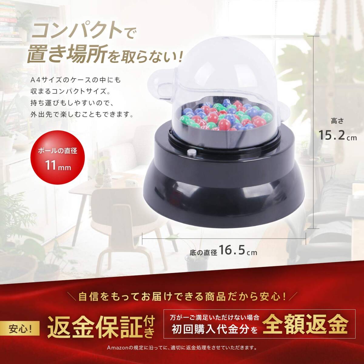 【仕様】・サイズ:底面直径…11.5cm、高さ…12cm、ボール直径…0.9cm ・材質:本体…ABS+AS、ボール…ABS ・使用電池:単3形アルカリ乾電池2本使用(日本国内メーカー製の電池を標準で付属) ・セット内容:ロトマシーン本体×1、ボール×49個、単3形アルカリ乾電池×2本、ロトシート×3枚