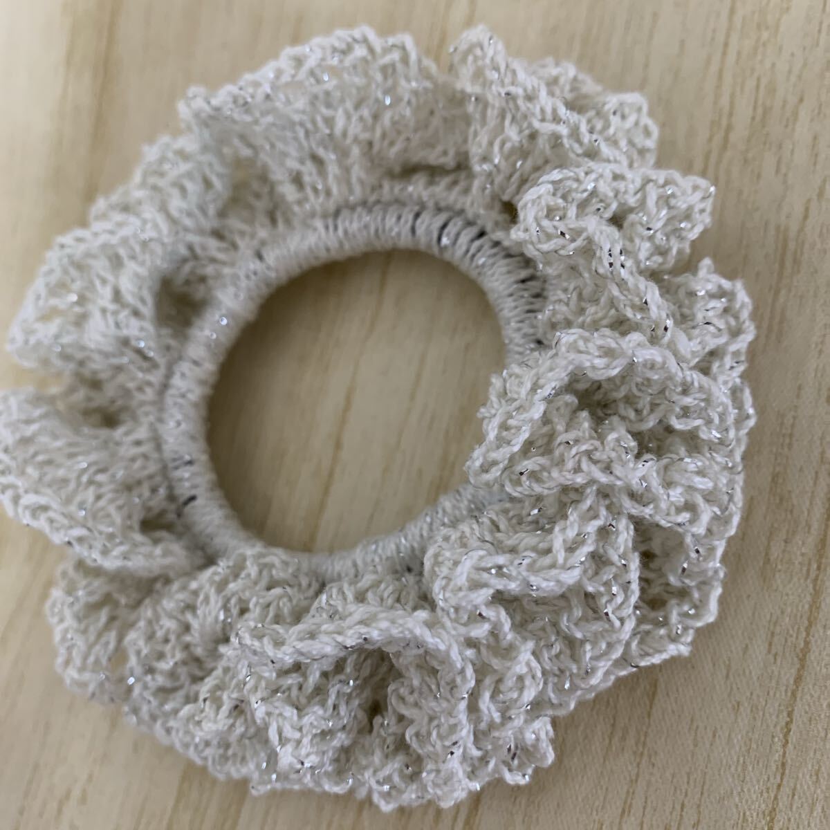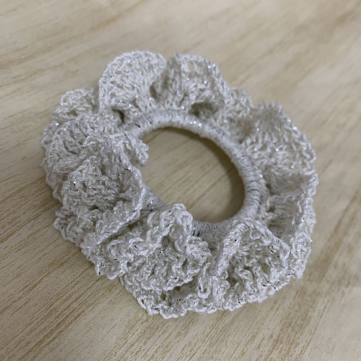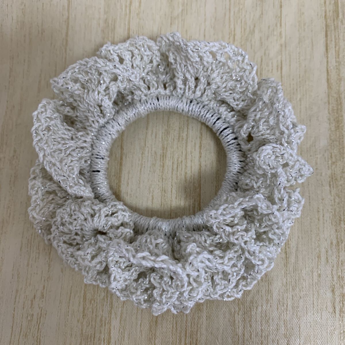 手作り 手編み かぎ針 かぎ針編み ヘアアクセサリー ヘアアクセ アクセ アクセサリー ヘアゴム ゴム シュシュ シルバー ラメ グリッター キラキラ ホワイト 白 清楚 オフィス OL フェミニン ロリータ 純白 冬 スノー 雪