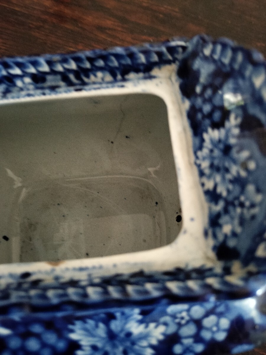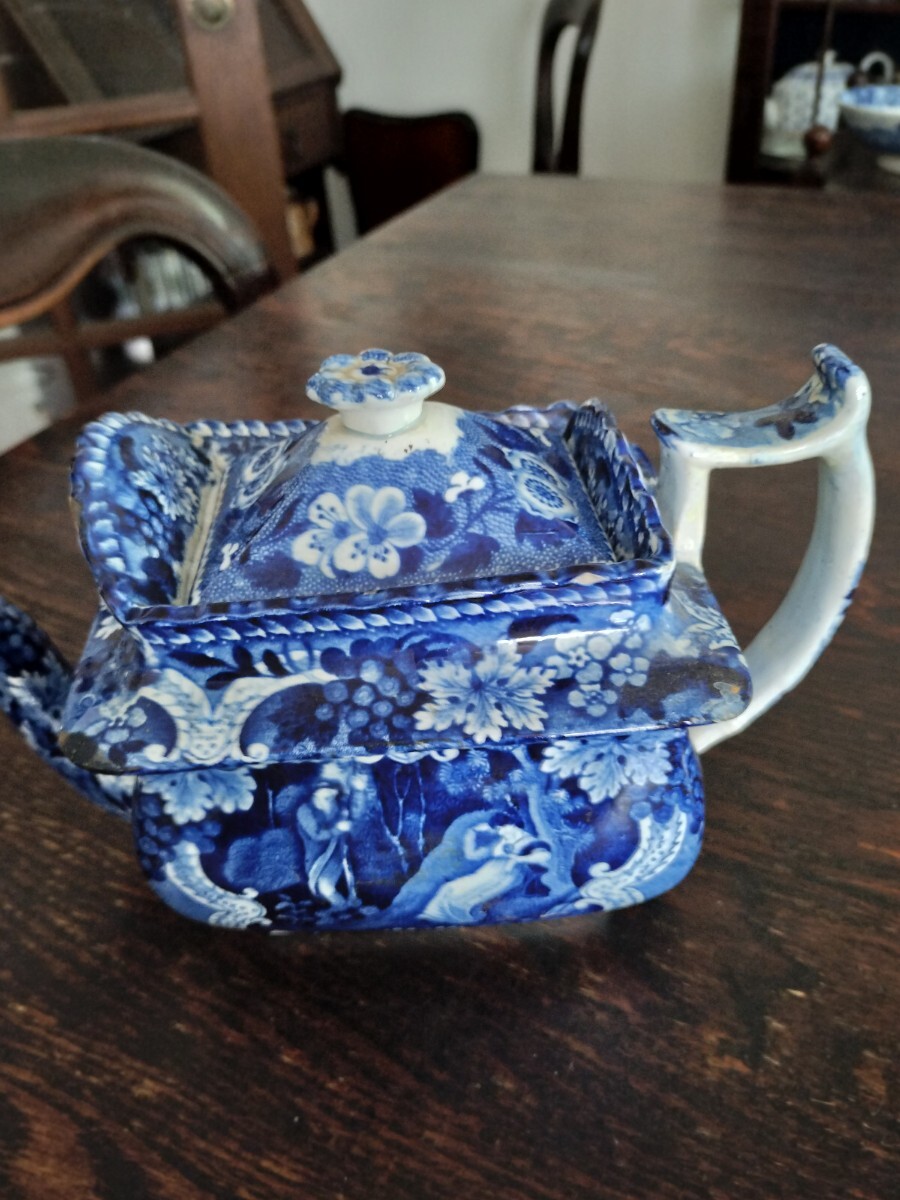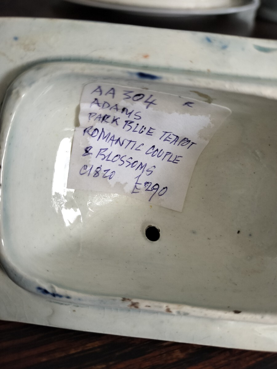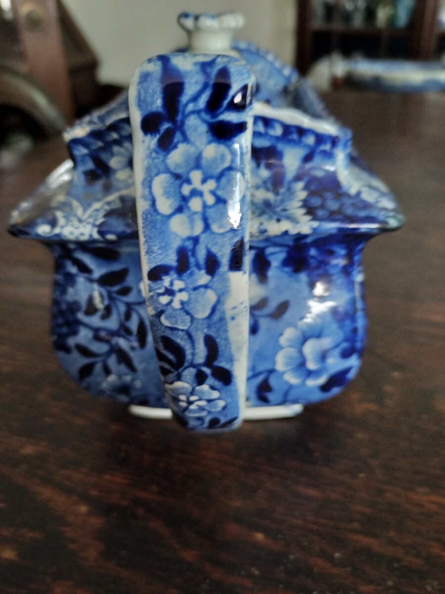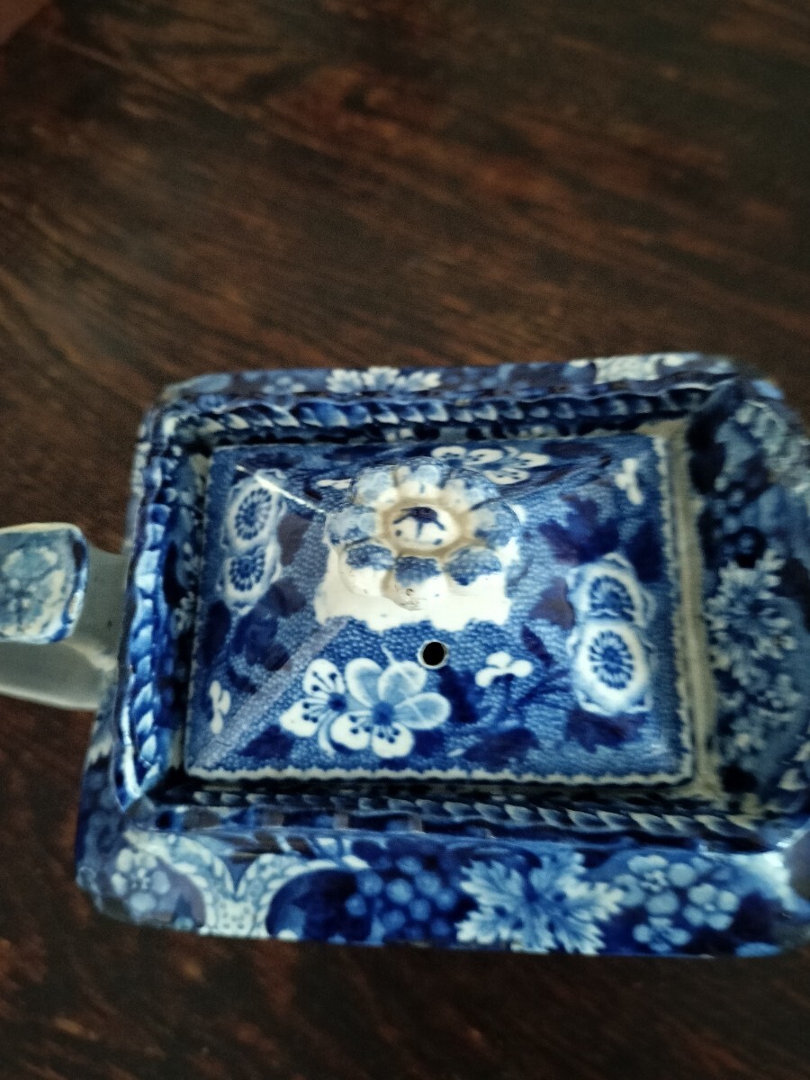 以前にロンドンの骨董店で手に入れた品。ブルーアンドホワイトの専門店です。古く入手が困難なこういった品が店内に足の踏み場も無いほどありました。今はこういったお店も品も影もありません。この品はポットの蓋に説明がありますよう1820年製の図柄も色合いも特別な品です。飾っていました。古い品ですのでクラックがありますが水漏れはありません。