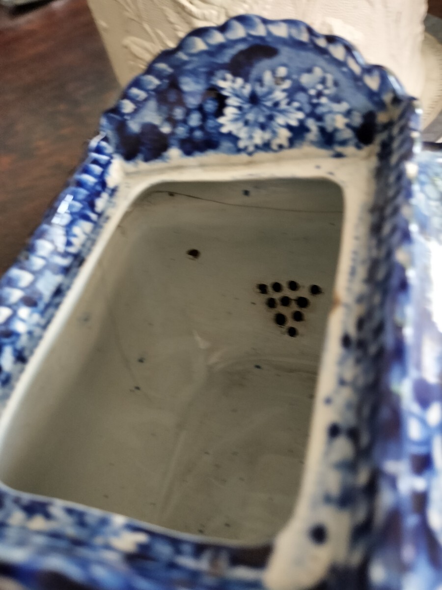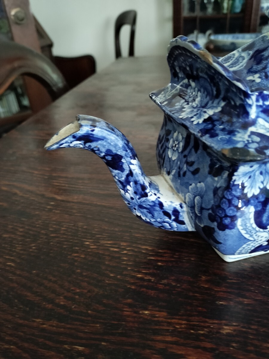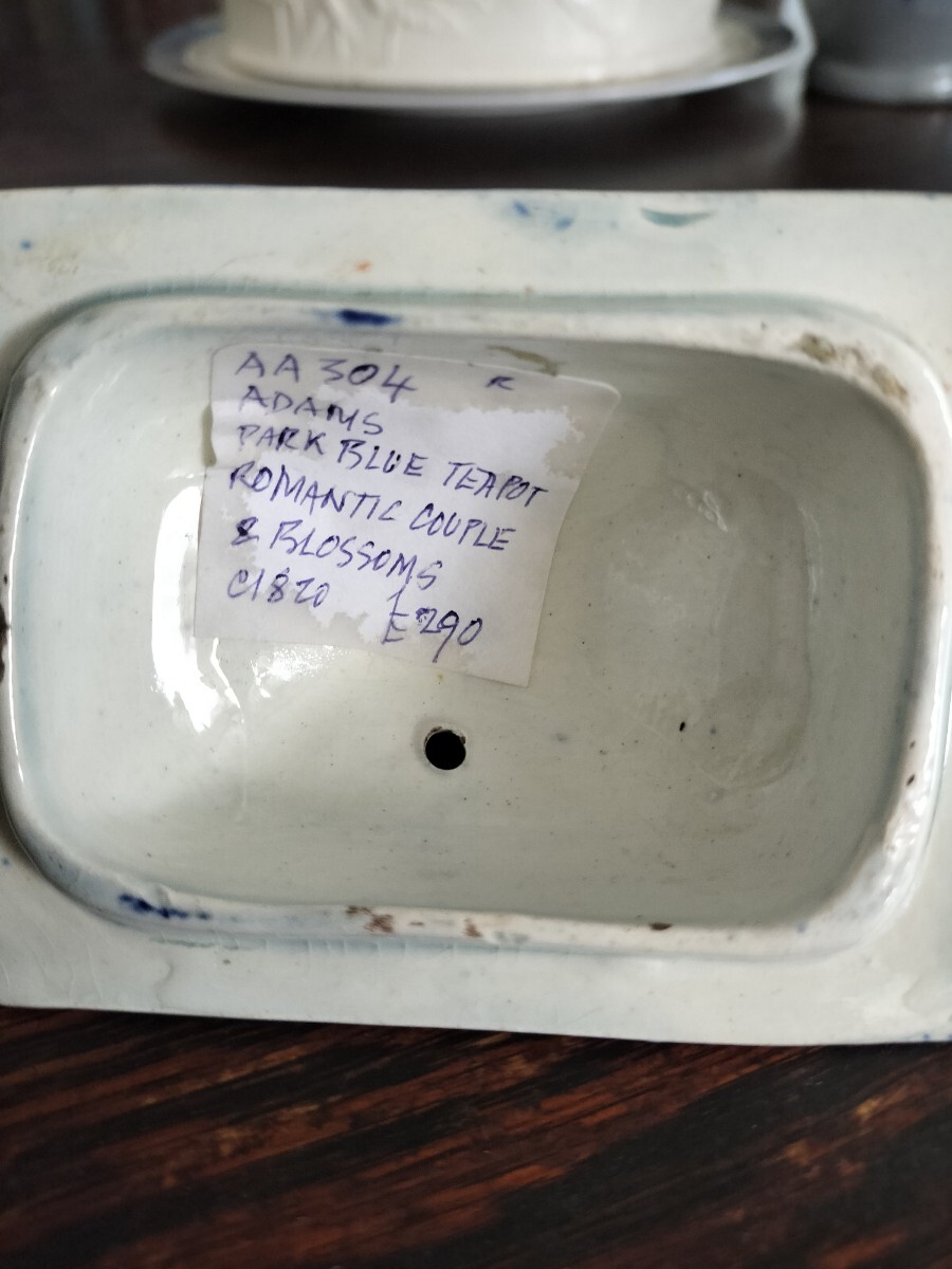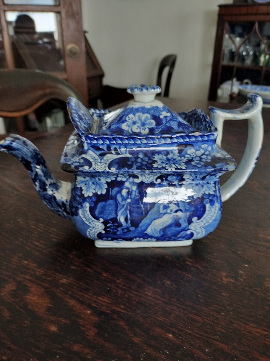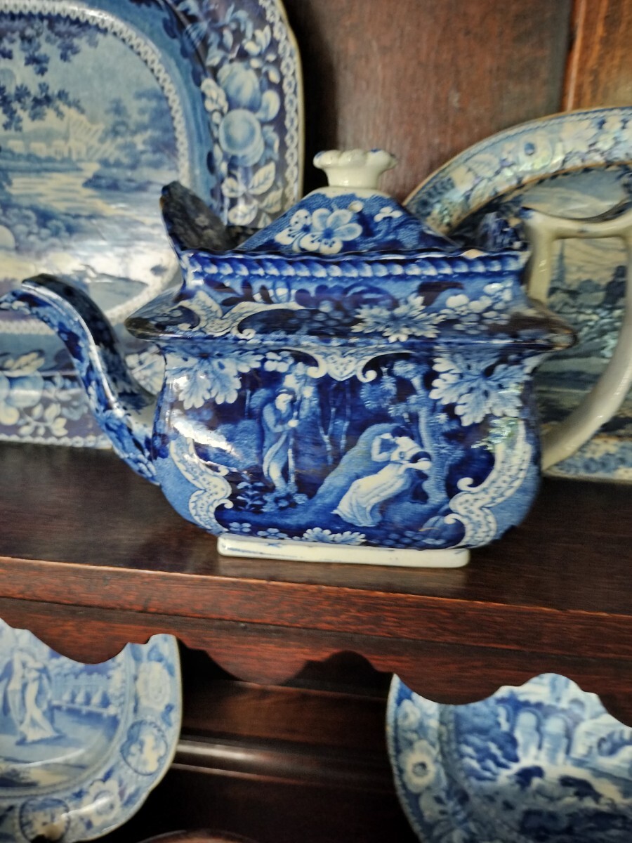 以前にロンドンの骨董店で手に入れた品。ブルーアンドホワイトの専門店です。古く入手が困難なこういった品が店内に足の踏み場も無いほどありました。今はこういったお店も品も影もありません。この品はポットの蓋に説明がありますよう1820年製の図柄も色合いも特別な品です。飾っていました。古い品ですのでクラックがありますが水漏れはありません。