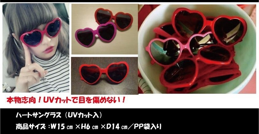 | 可愛いハートのUVカットサングラス。パーティや変装用にも。 |