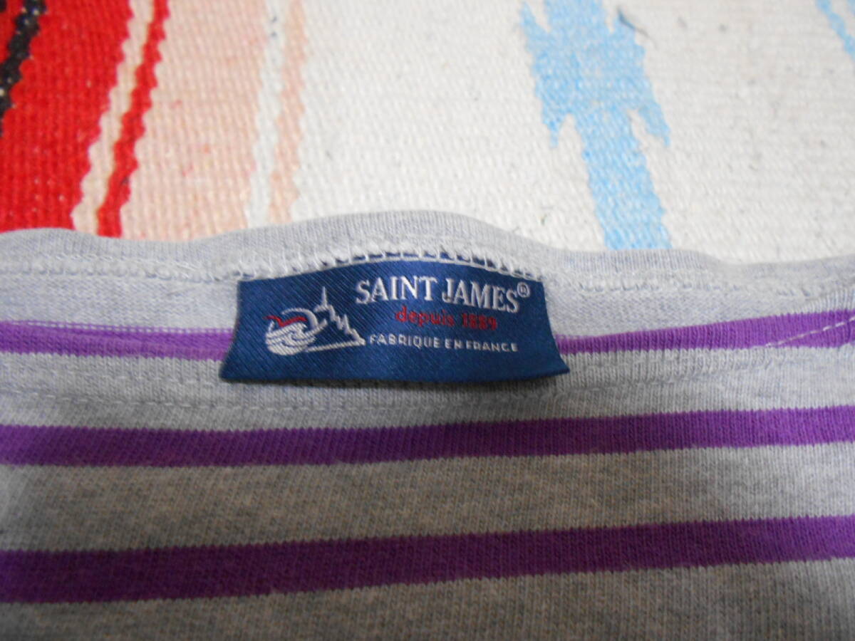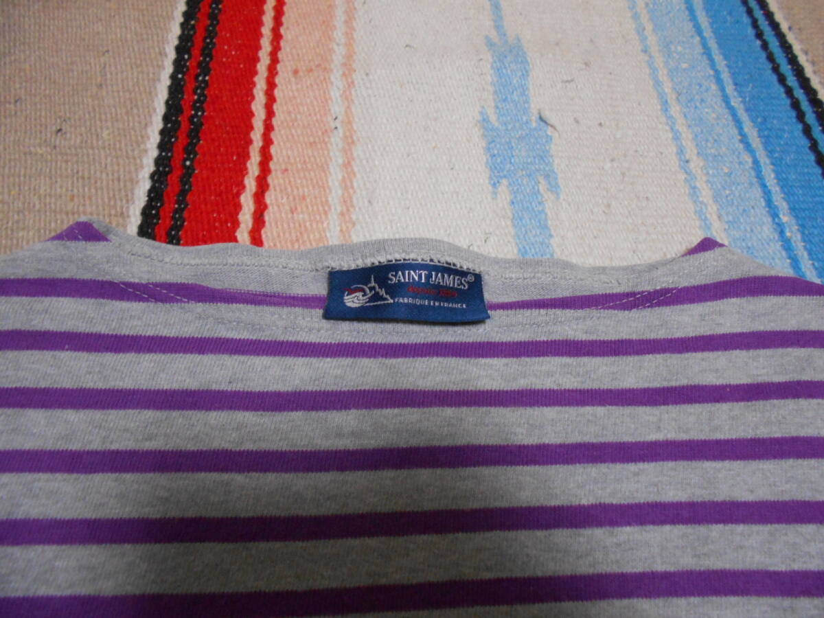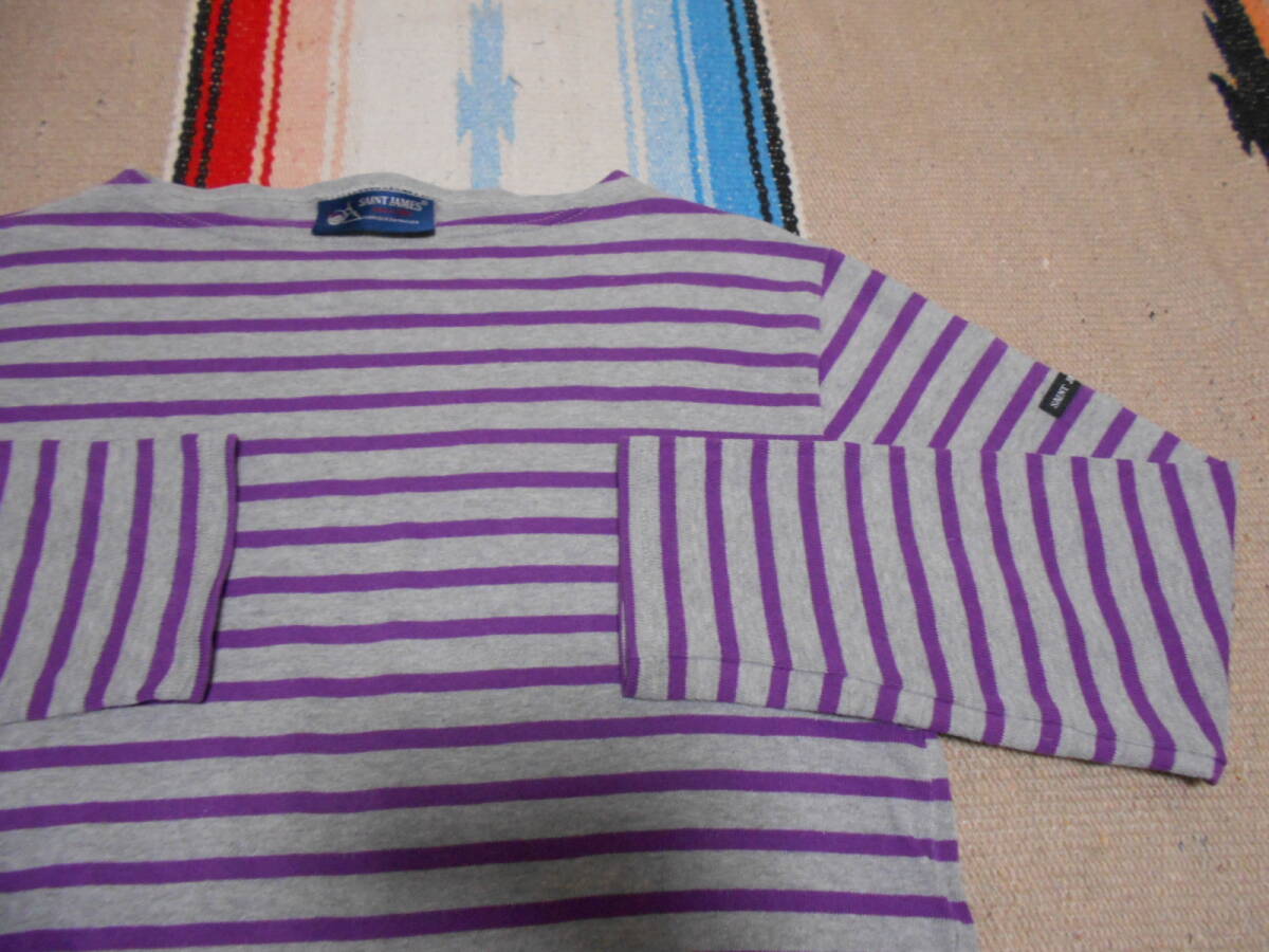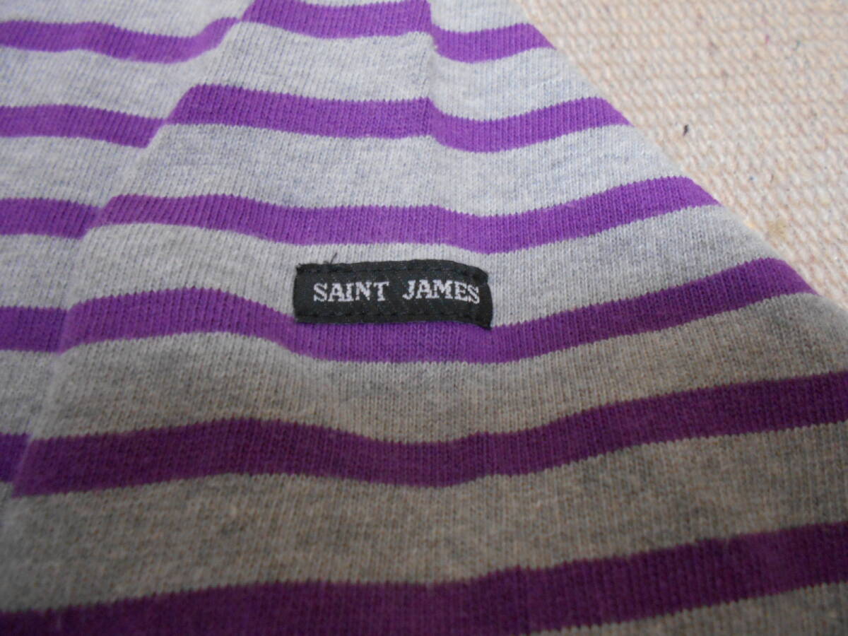 SAINT JAMES 伝統の良質な厚手コットン100%素材、オリジナルのタイト目なシルエットと絶妙なネックのカット、風合いある発色の グレー × ライトパープル のボーダー柄が極めて良いフレンチテイスト