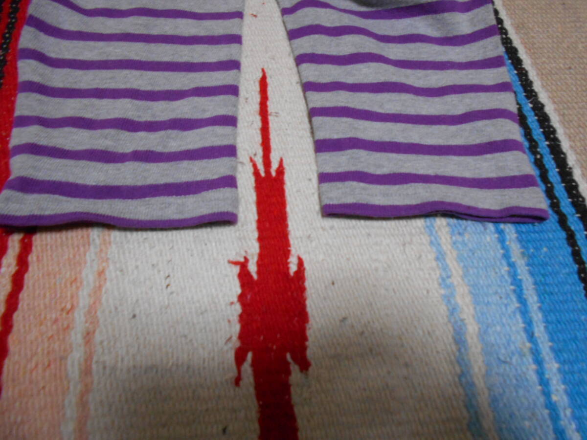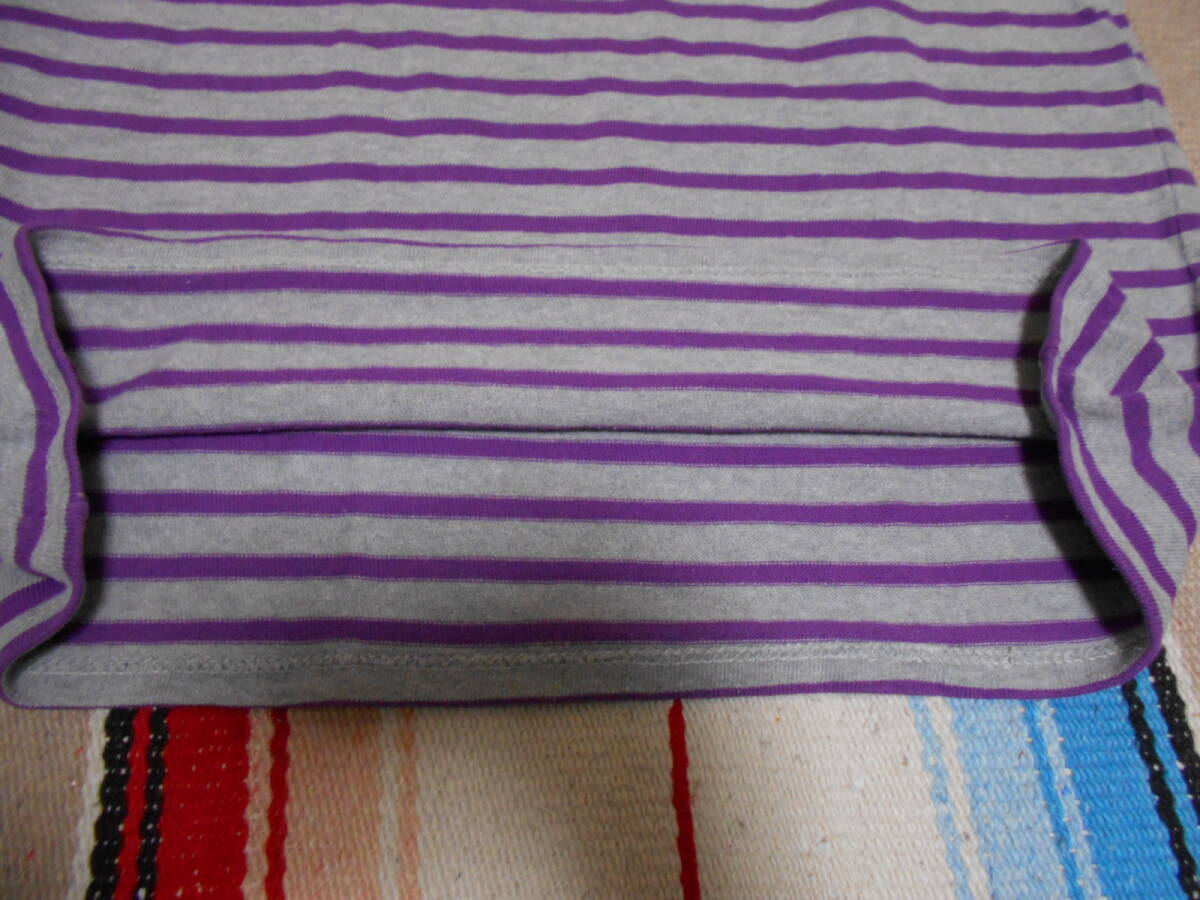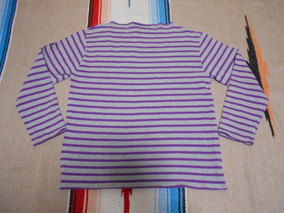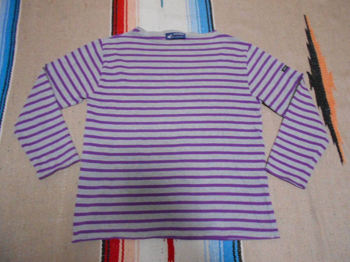SAINT JAMES 伝統の良質な厚手コットン100%素材、オリジナルのタイト目なシルエットと絶妙なネックのカット、風合いある発色の グレー × ライトパープル のボーダー柄が極めて良いフレンチテイスト