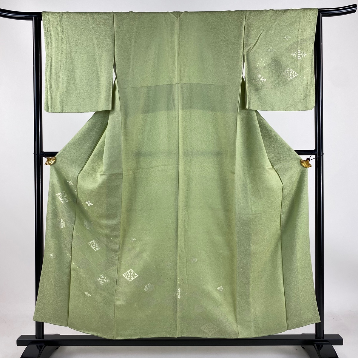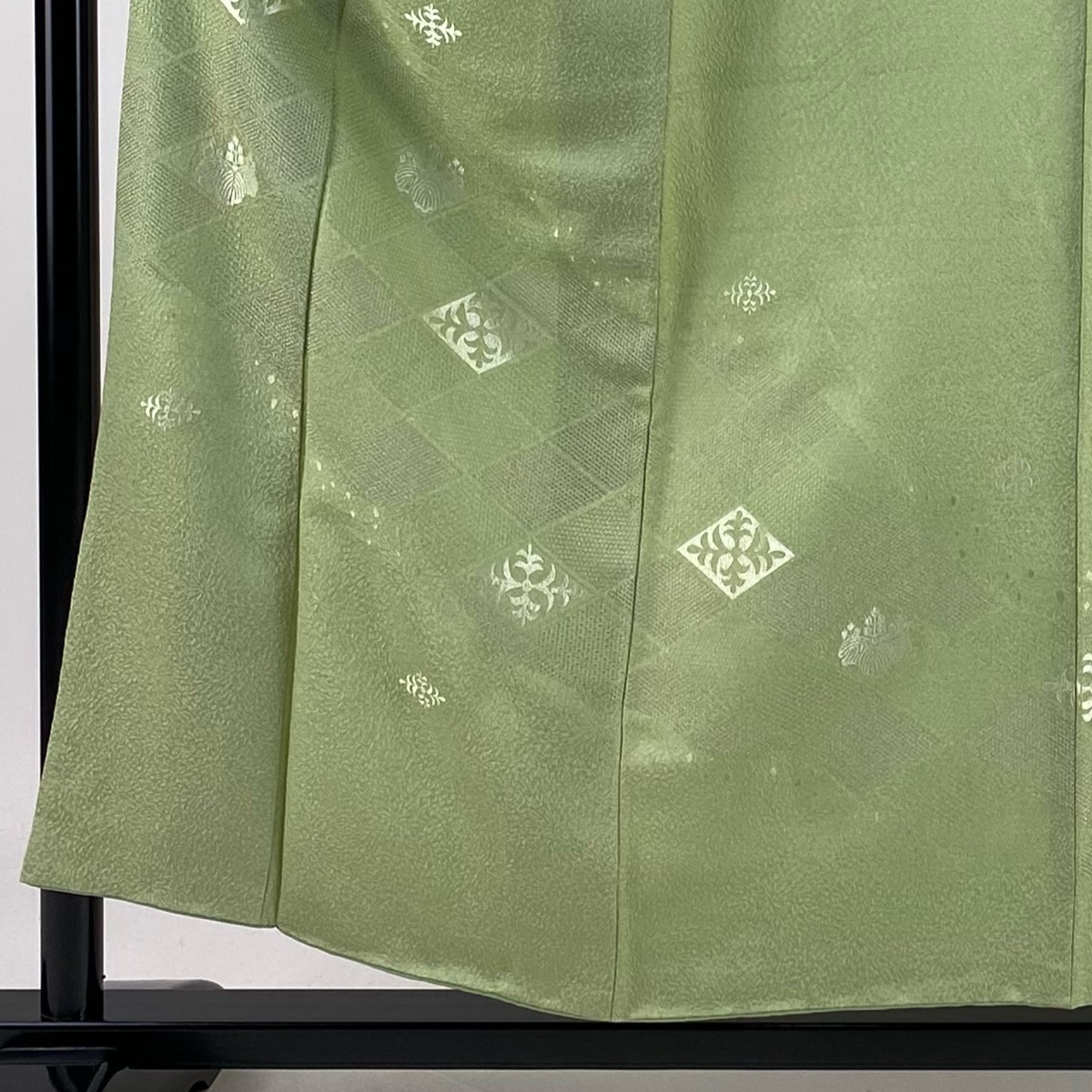 | 付下げ 秀品 桐 菱格子 刺繍 銀糸 黄緑色 袷 身丈154.5 裄丈63 S 正絹 【中古】 |