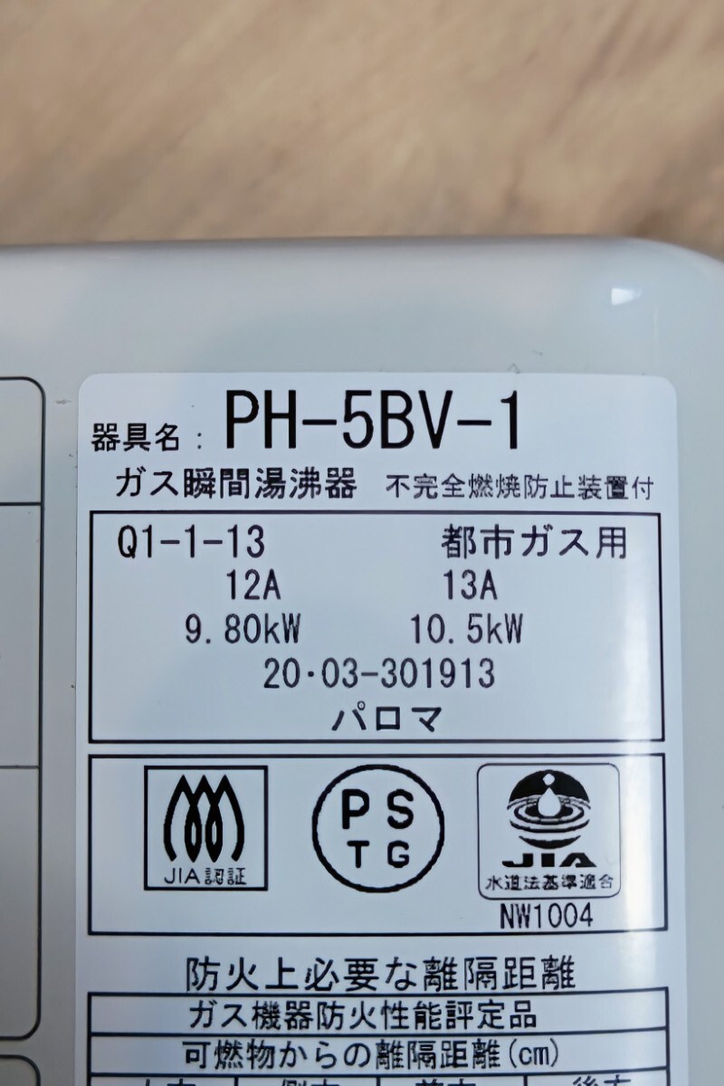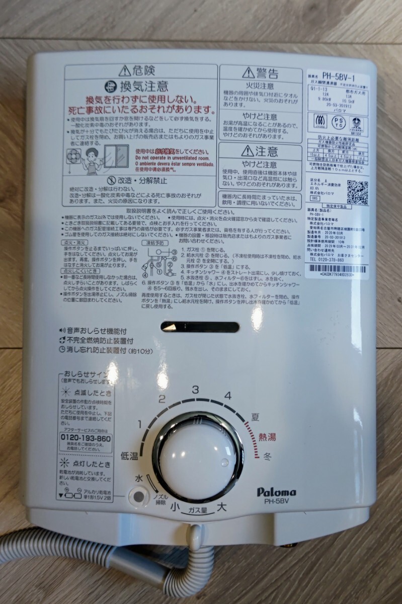 【中古品】パロマ 小型湯沸器『PH-5BV-1』都市ガス用(2020年3月製造)Paloma