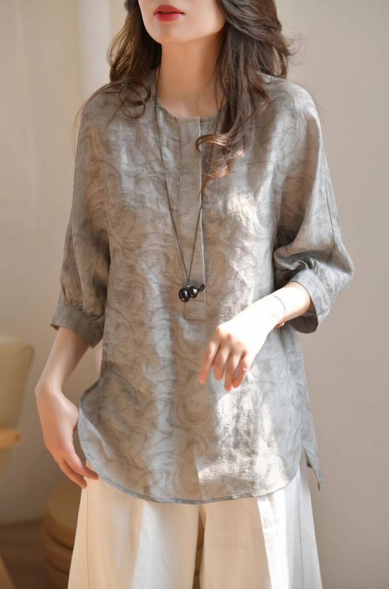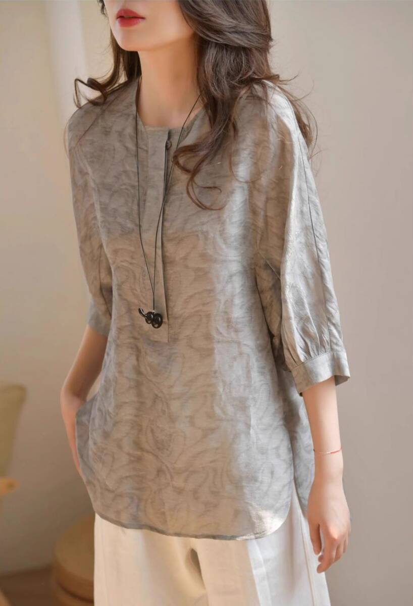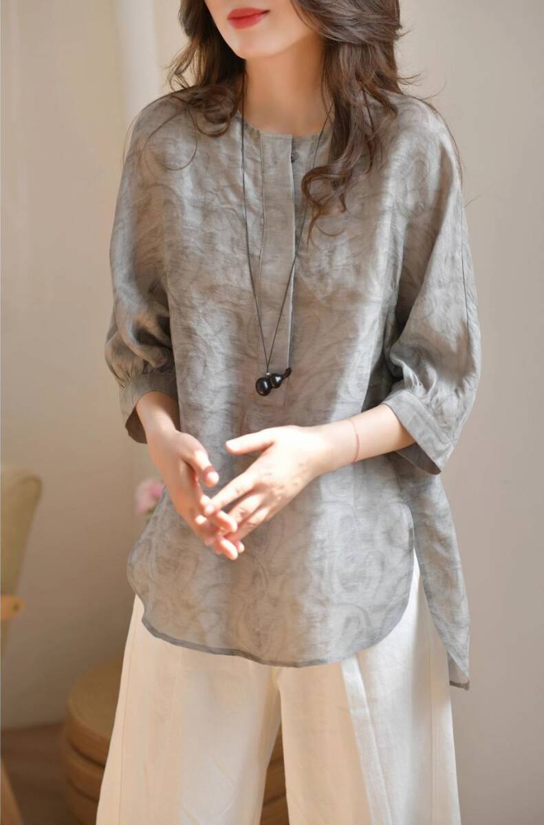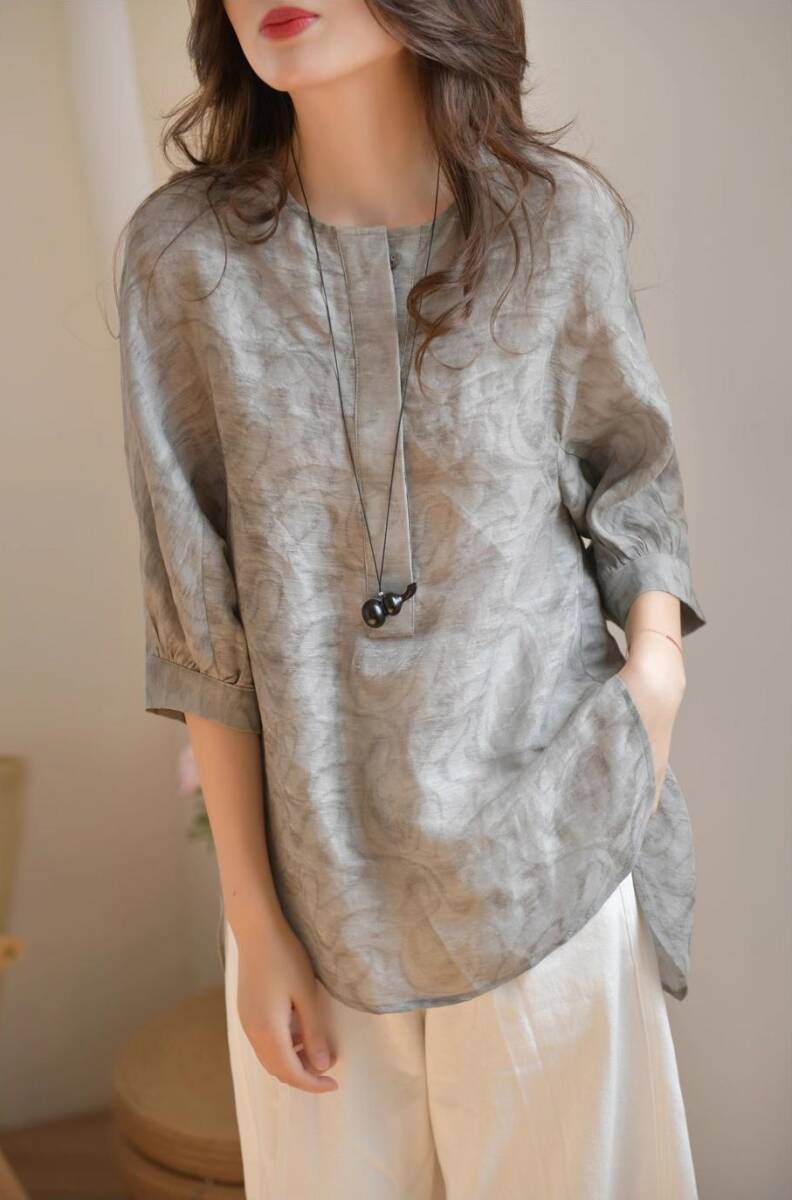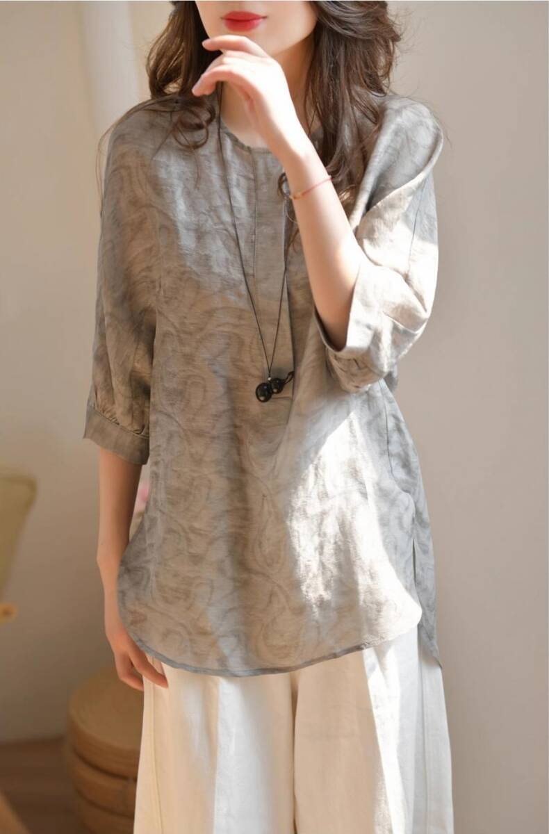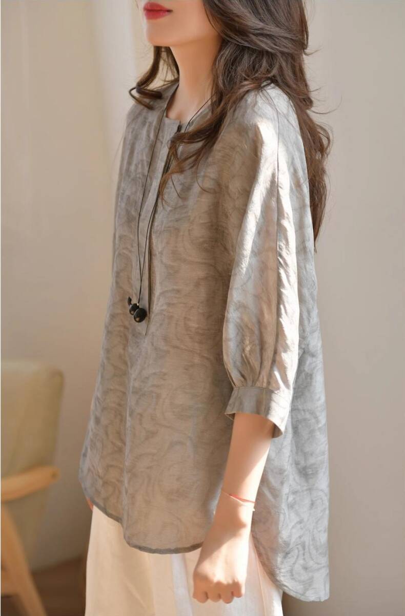 「同梱1万円送料無料」チュニック 半袖 ブラウス 復古風 レディース ロングTシャツ 大人 可愛い キレイめ プリント柄 大きいサイ