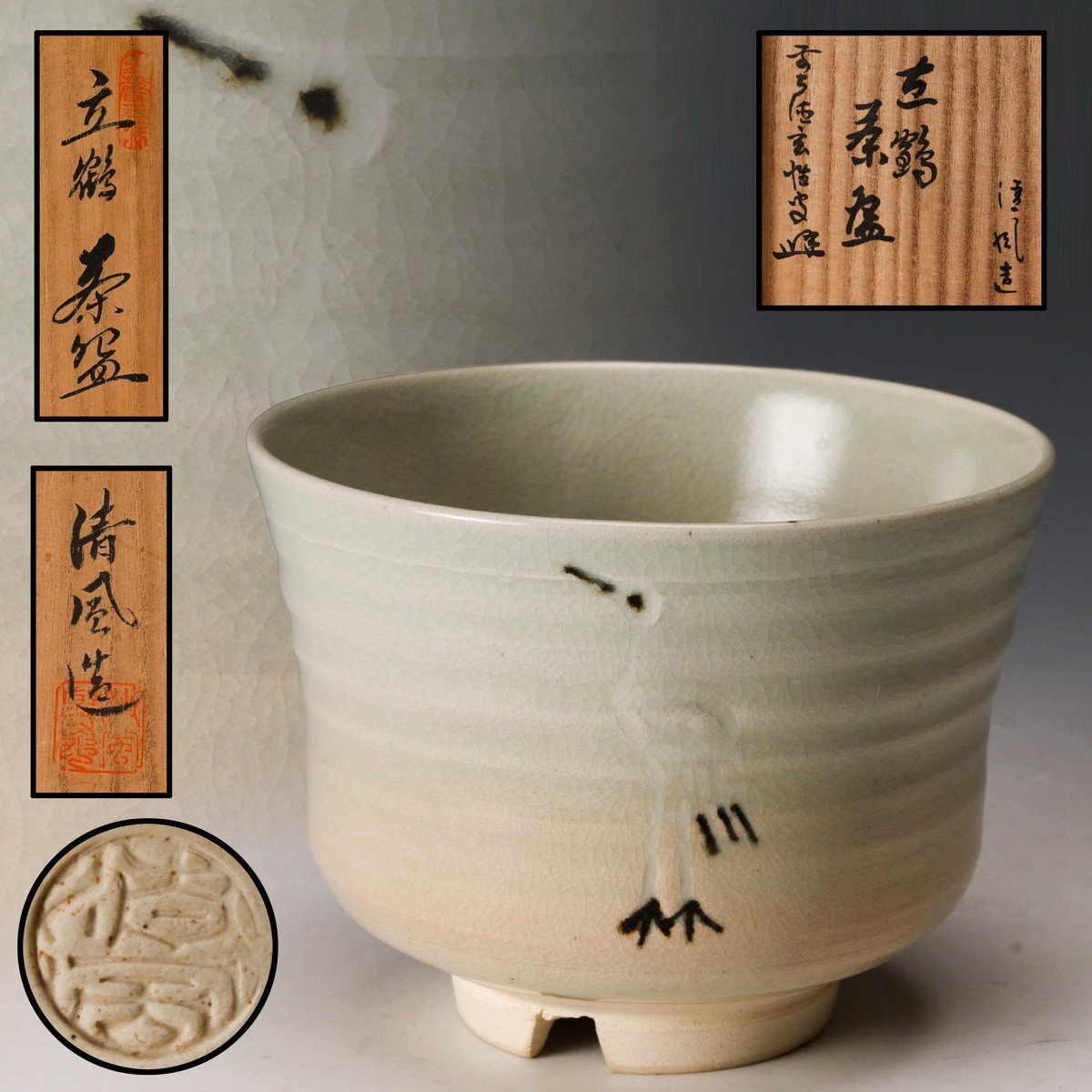 【佳香】清風与平 立鶴茶碗 大徳寺塔頭黄梅院住職紫野宮西玄性書付箱 栞 共布 茶道具 本物保証