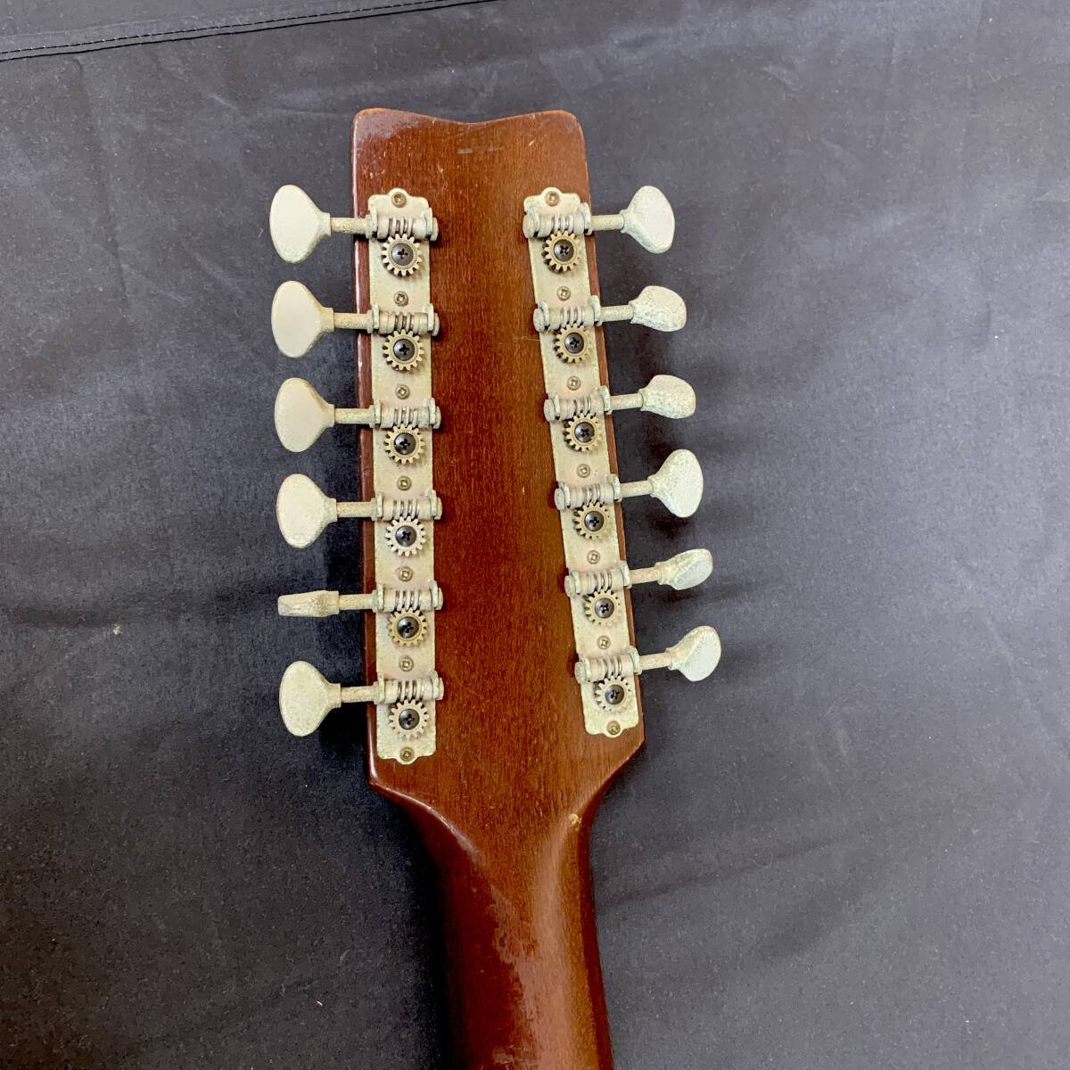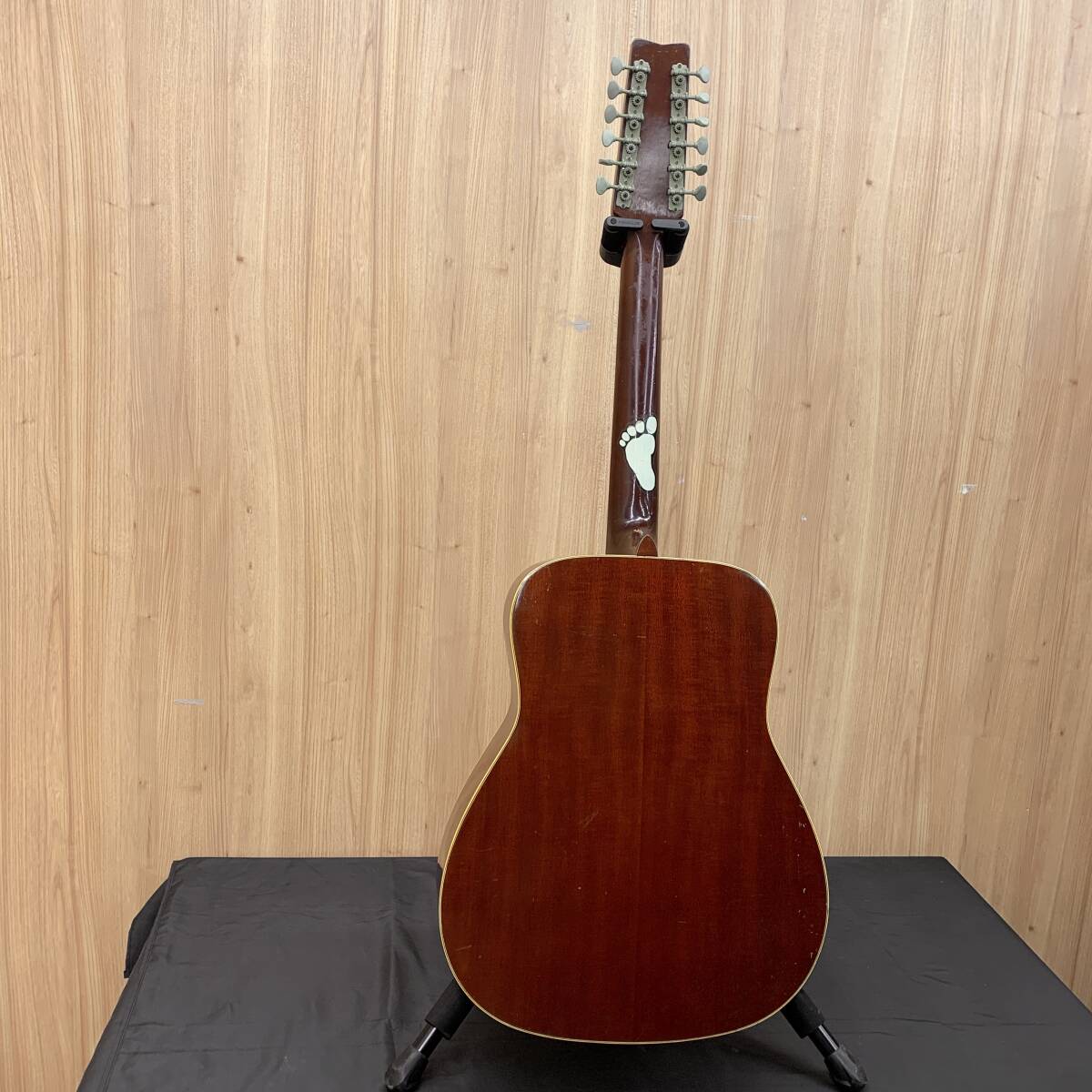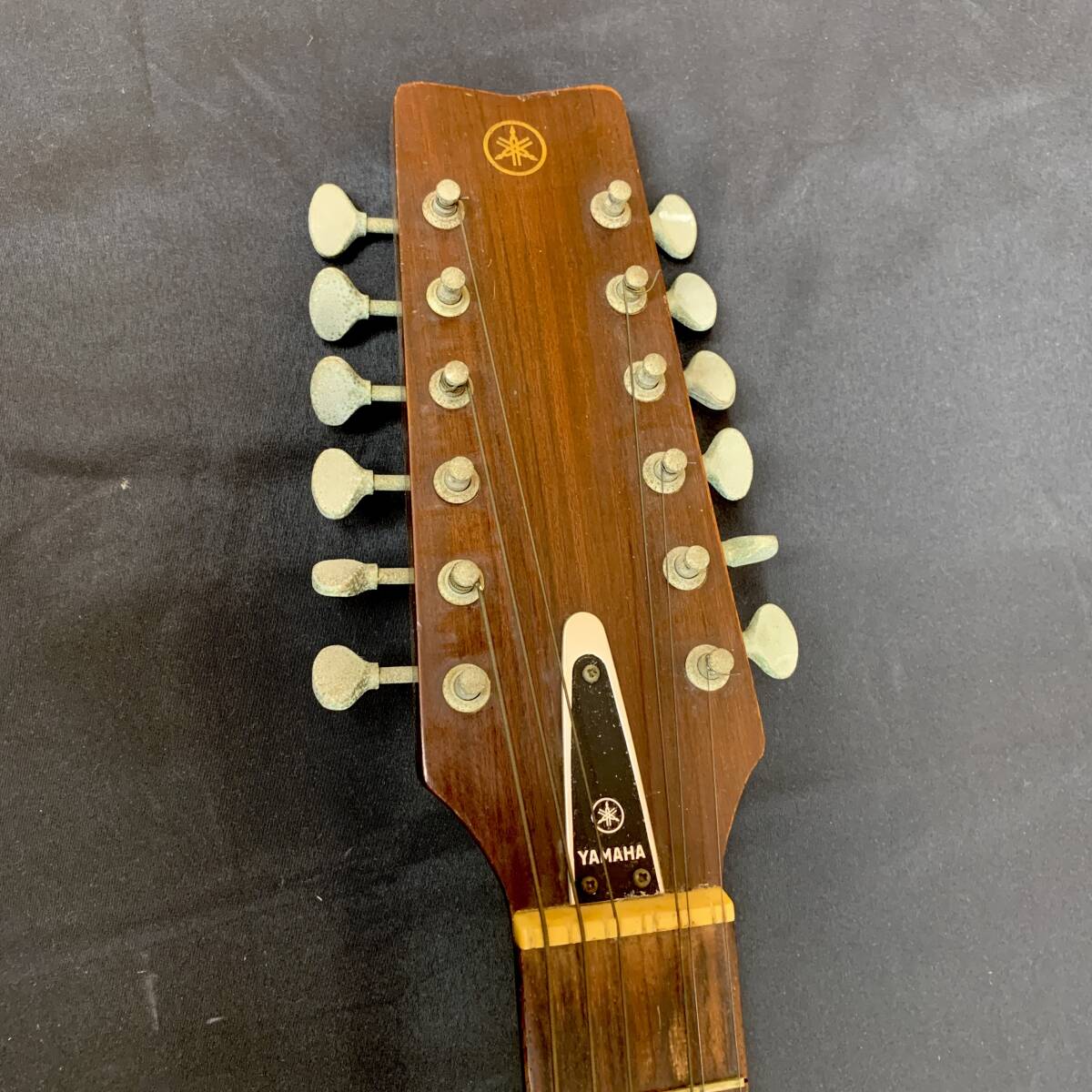 傷や打痕、ステッカー、錆等ダメージが多く、ネックはロッドが緩み切りで指板が波打ち状態のハイ起き気味、フレットも所々浮いてきており、弦高もかなり高くなっておりますので要修理品扱いとなります。