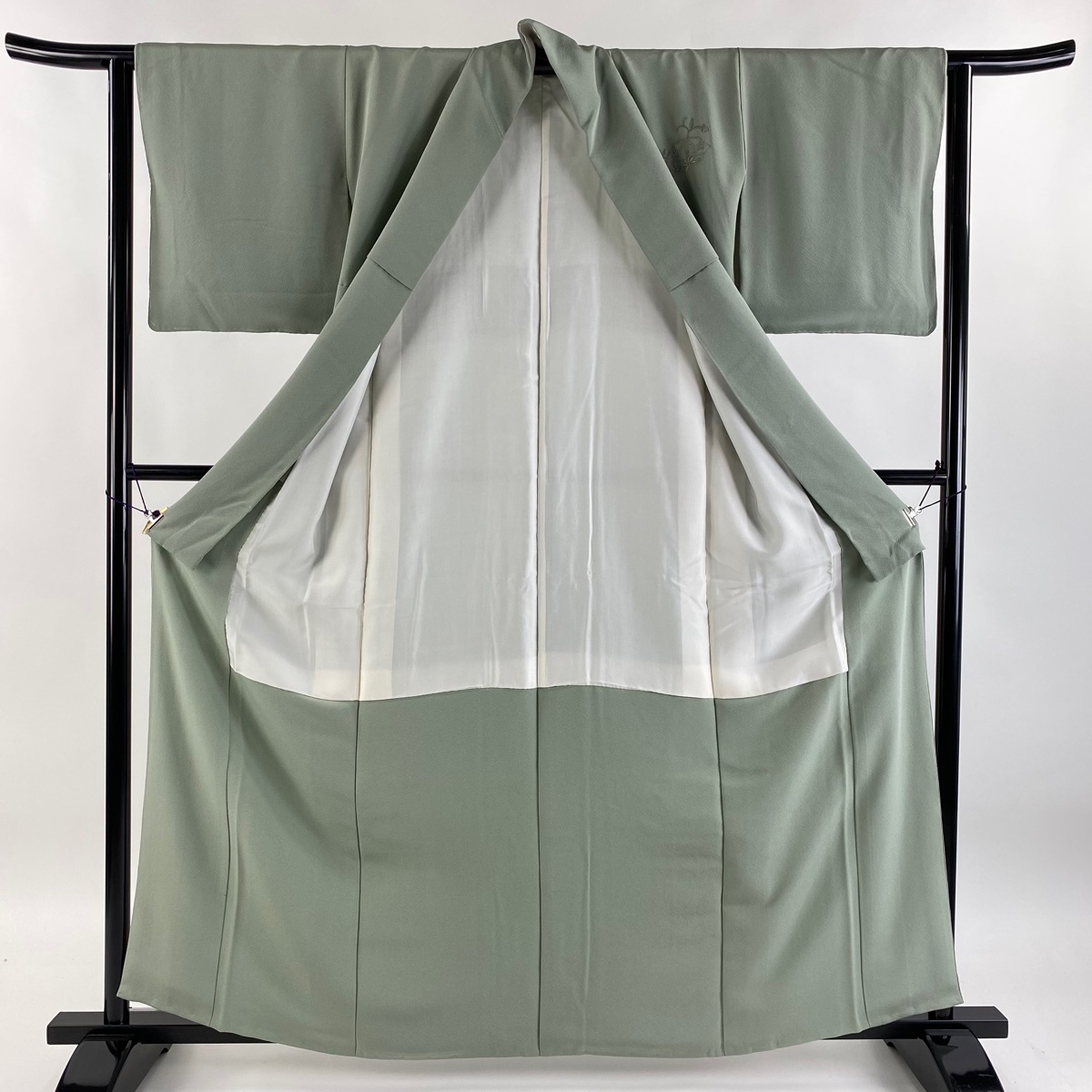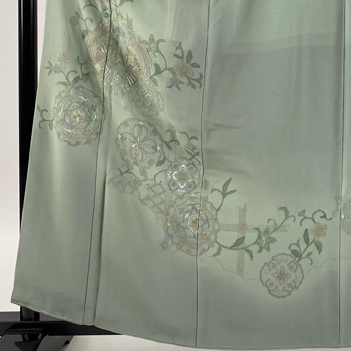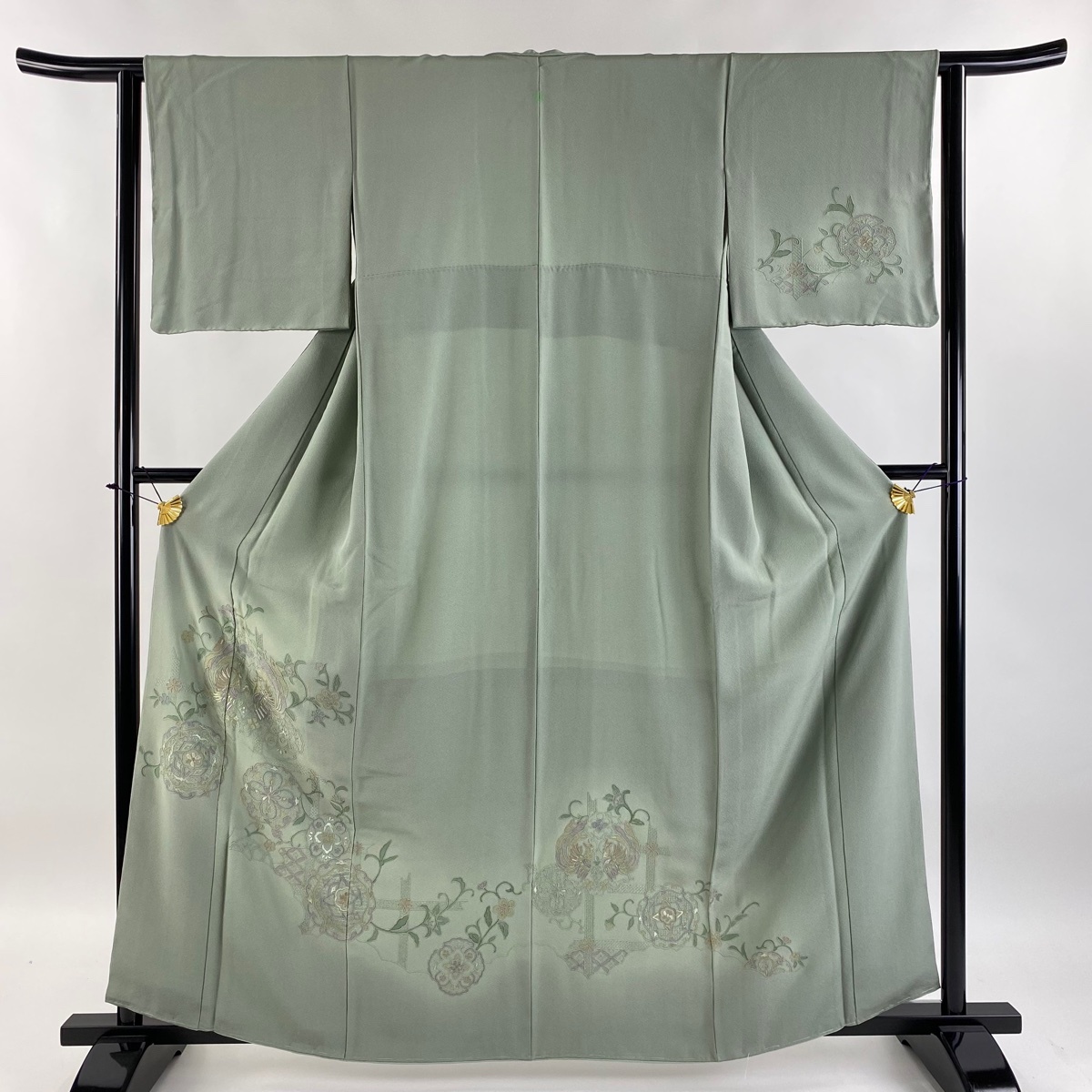 | 付下げ 名品 華文 向かい鳥 刺繍 灰緑 袷 身丈161 裄丈62.5 S 正絹 【中古】 |
