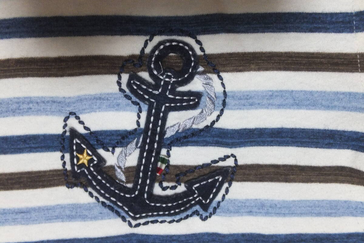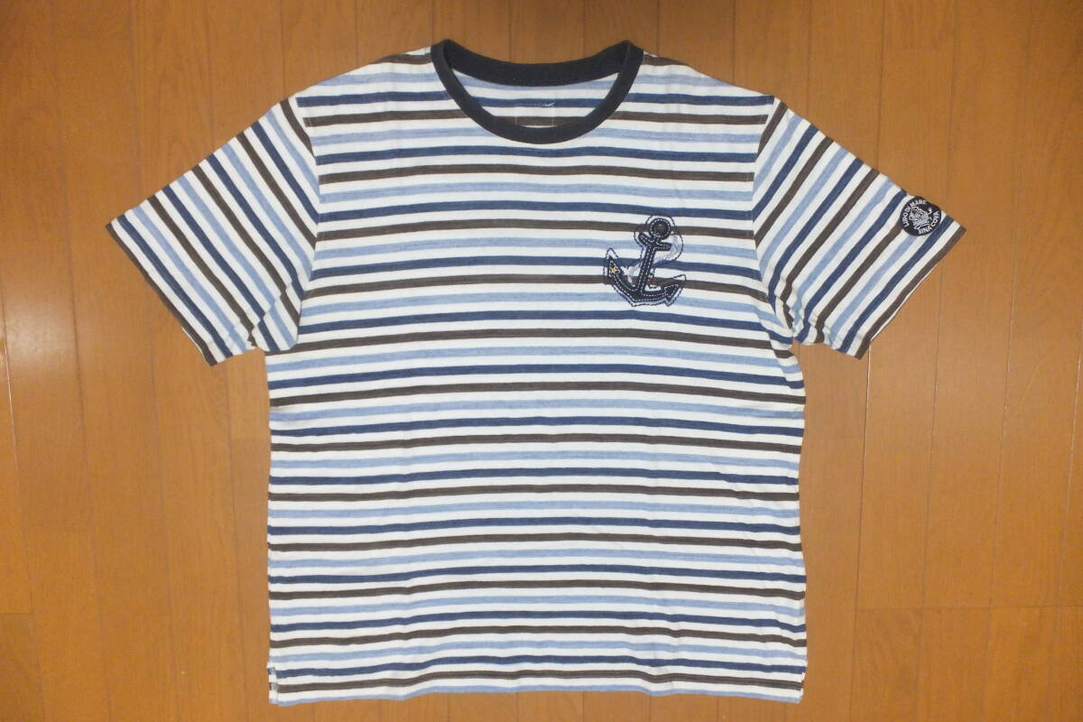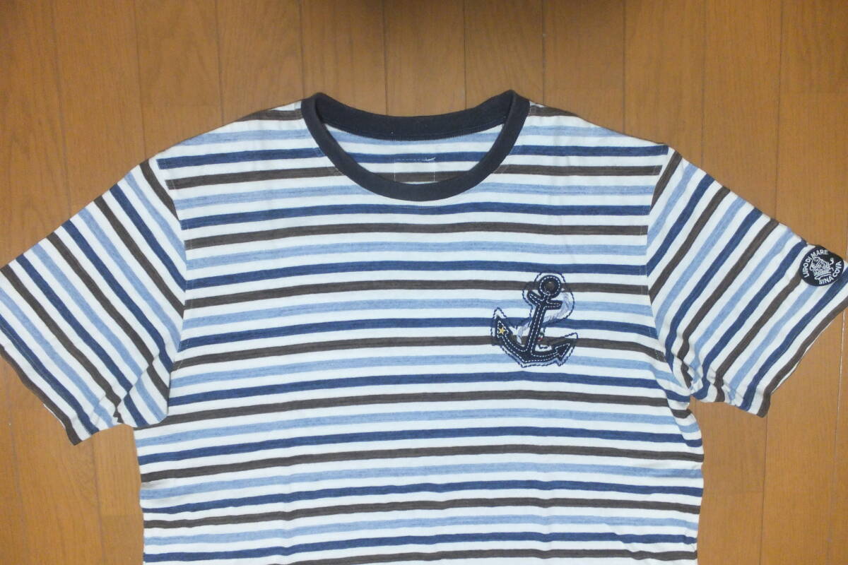 中古・カスタム 【シナコバ 半袖 Tシャツ LLサイズ 白色系ボーダー】 ホワイト系 XL 《襟の内側のタグを外側へ移動》 イカリのワッペン (9.2cm×8.5cm) 日本製 Made In Japan SINA COVA | |