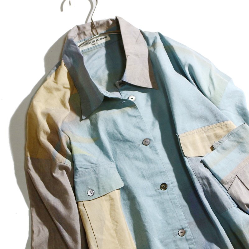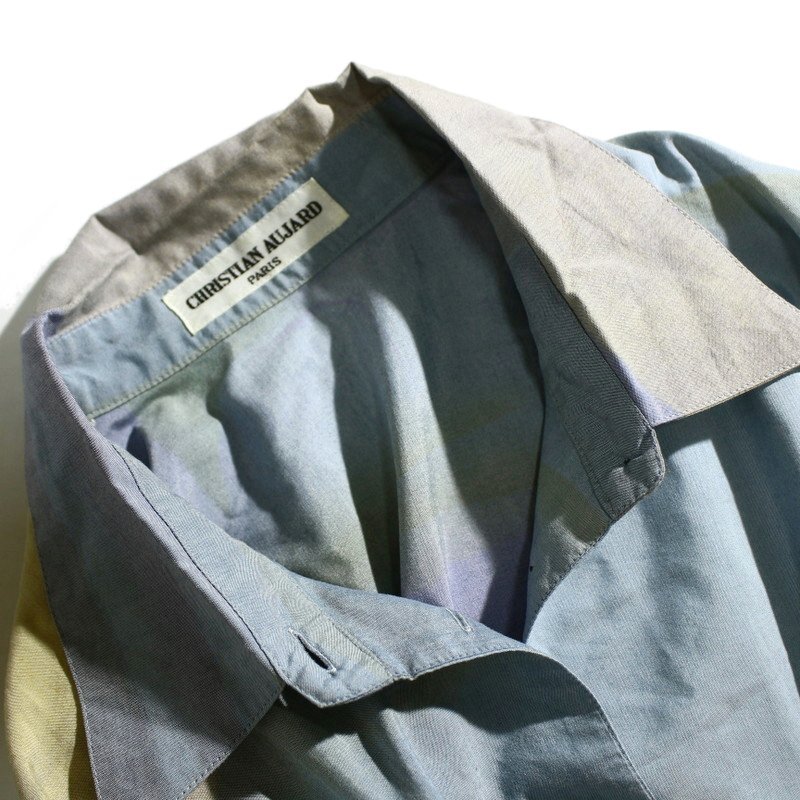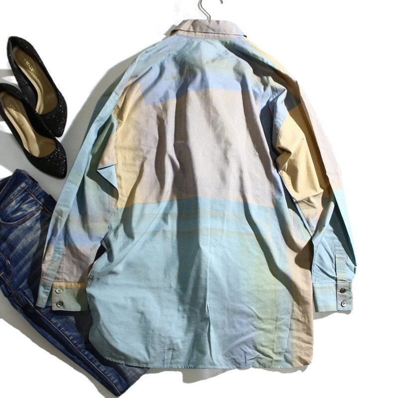 美品 CHRISTIAN AUJARD クリスチャン・オジャール 高級感 ミセス ぼかし カラフル 淡色 ゆったり デザイン 長袖 シャツ 9T 水色 お洒落