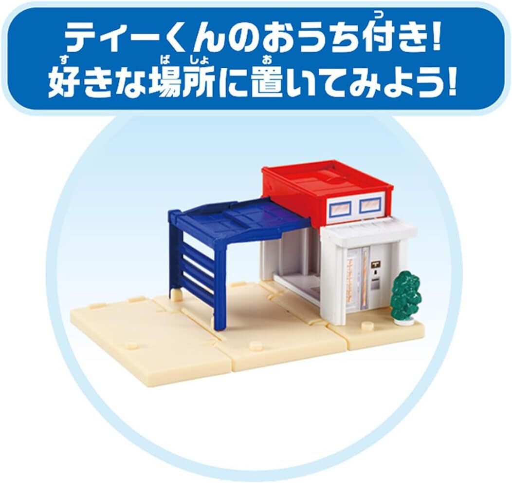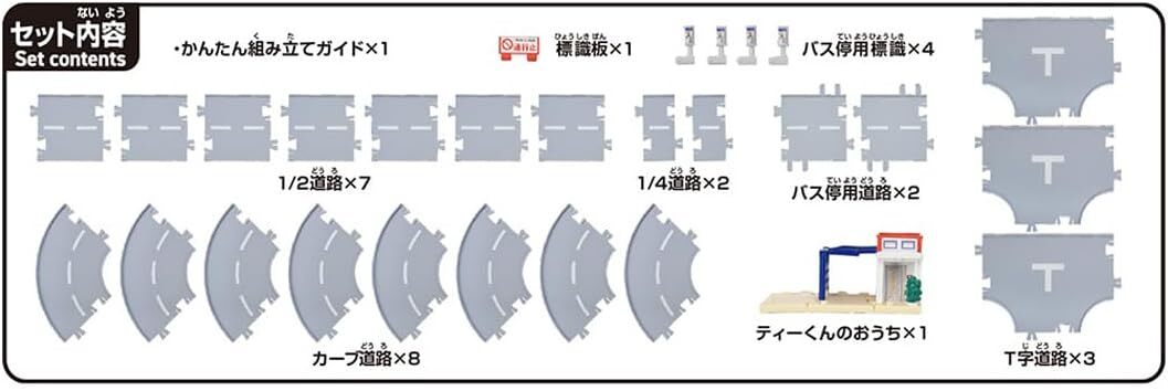 1/2道路×7、1/4道路×2、カーブ道路×8、T字道路×3、バス停用道路×2、バス停用標識×4、ティーくんのおうち×1、標識板×1、取扱説明書(かんたん組み立てガイド)×1