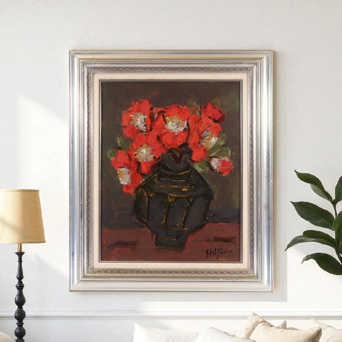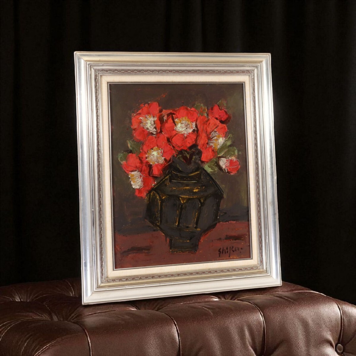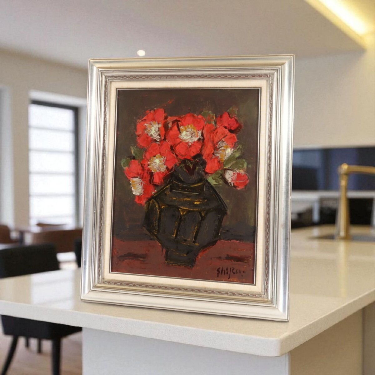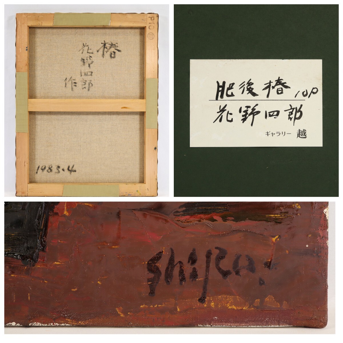 真作 花野四郎 1983年油彩「椿」画寸 P10 ギャラリー越取扱い 厚塗りで立体感あり力強い筆致と鮮やかな色彩で肥後椿の美しさを表現 11368