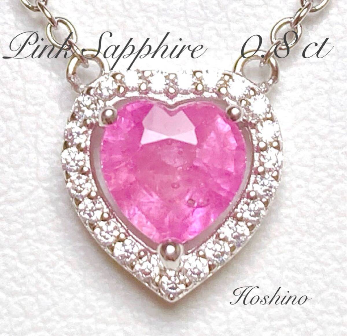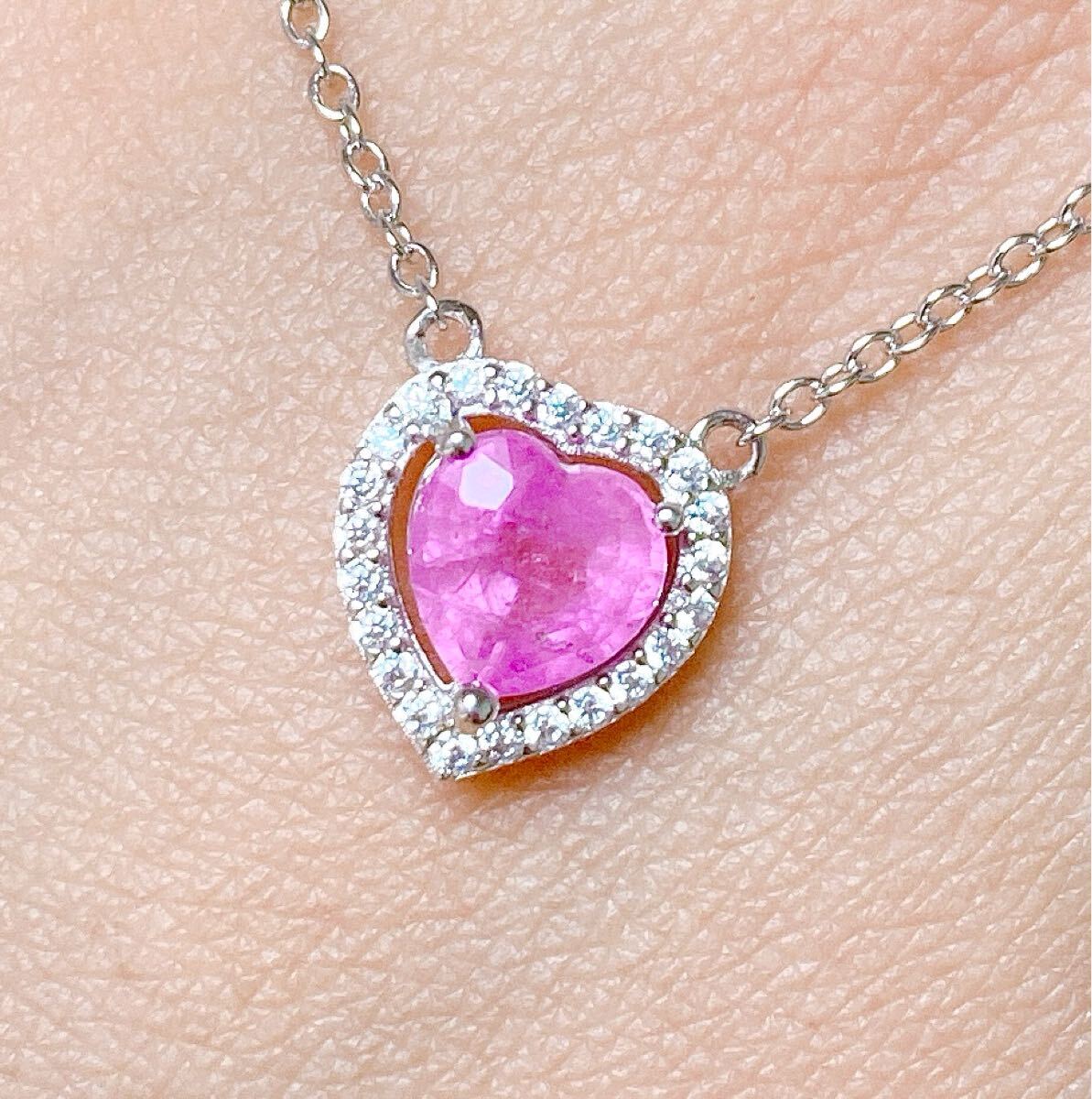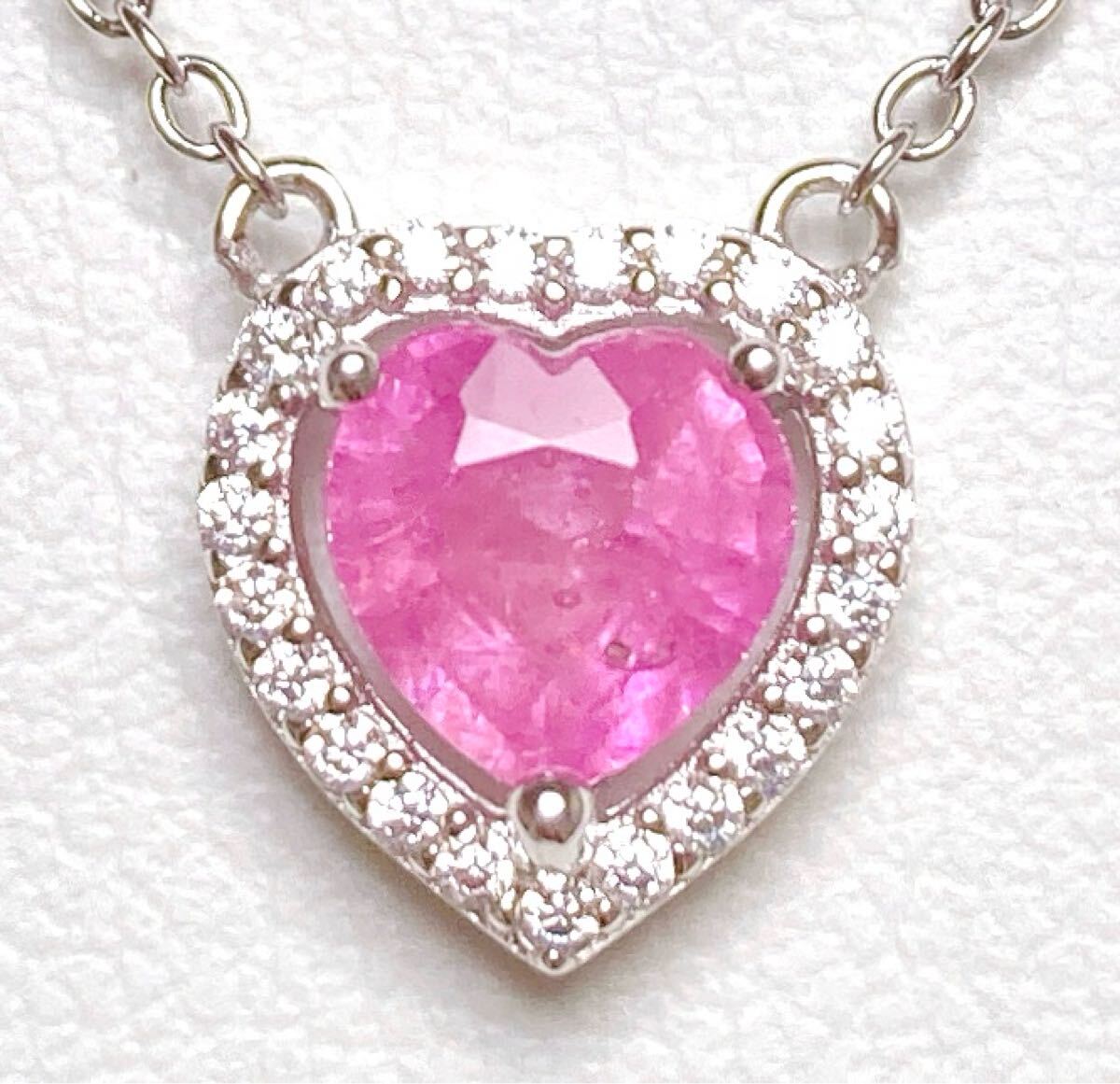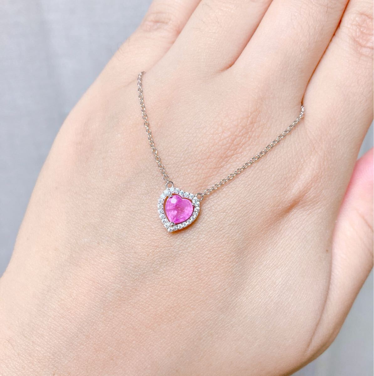 サファイアの中でも貴重な天然ピンクサファイアを可愛らしいハート形にカットし、ジルコニアダイヤの枠で囲み仕上げたハートモチーフの小ぶりで可愛いネックレスです。トップのサイズは枠込みで約9mm、中心石約7mm。透明感の高い美しい天然ピンクサファイアをおよそ0.8カラット使用しています。