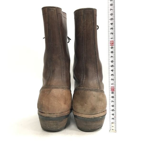 ◆商品説明◆ | ◆SIZE:8 1/2B 日本サイズ25.5-26.5程度 ※採寸は画像をご確認お願い致します。 ロゴマークや特徴から1970年代後期から80年代前半にかけて製造されたブーツではないかと思われます。 ソールはVibram社の刻印が入ったソールとなっており、耐久性が非常に高いです。 サイズは8 1/2Bとなります。スニーカーサイズ26.0が合う男性スタッフが試着したところ、紐を全て解いてギリギリ履く事ができ、甲の部分がやや窮屈という着用感でした。 甲が細く平べったい26.5サイズの方、普段海外製ブーツを履いている26.0サイズ相当の方、スニーカーサイズ25.5相当の方に合うサイズ感かと思います。 甲が厚めの25.0サイズの方でも、つま先は少し余りますが、問題なく履いていただけるのではないかと思います。 大変希少なお品ですので、お手入れをしていただき末永くご使用いただけましたら幸いです。 | ||||||||||||||||||||