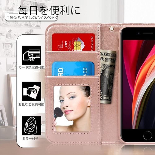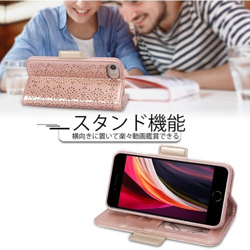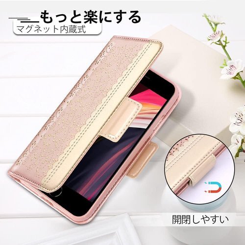 iPhone SE ケース 第3世代 透かし彫り模様 ワイヤレス充電対応 鏡付き 高級PUレザー 手帳型 カード収納 マグネット式 スタンド機能 ストラップ付き アイフォン 4.7インチ iPhone SE 第3世代/第2世代 /iPhone8 /iPhone7 対応 スマホケース ローズゴールド 42