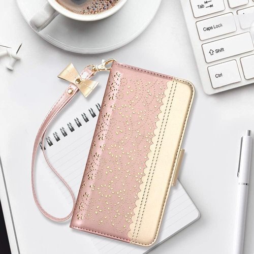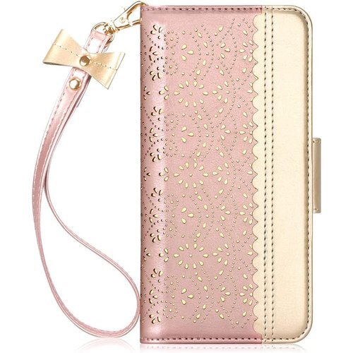 【おしゃれな外観】高品質なPUレザー素材を採用、表地にレーザー透かし彫りを施した手帳型ケースです。透かしの奥にゴールドがきらきら輝くと、優しい色合いで大人可愛いを演出してくれます。