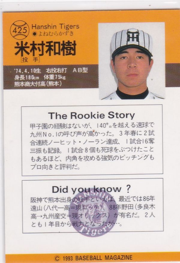 ●1993BBM【安達 智次郎/米村 和樹】 ルーキーカード 424,425:阪神