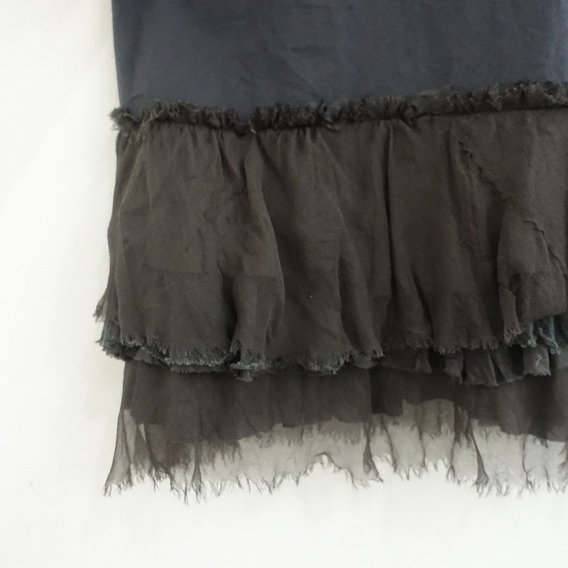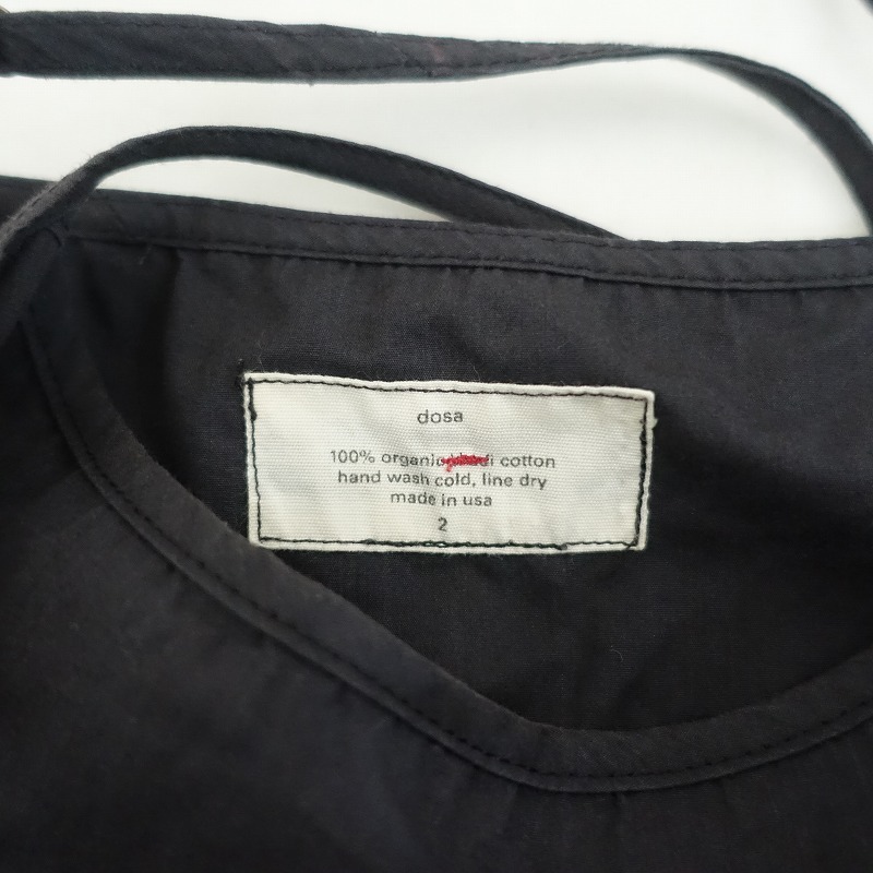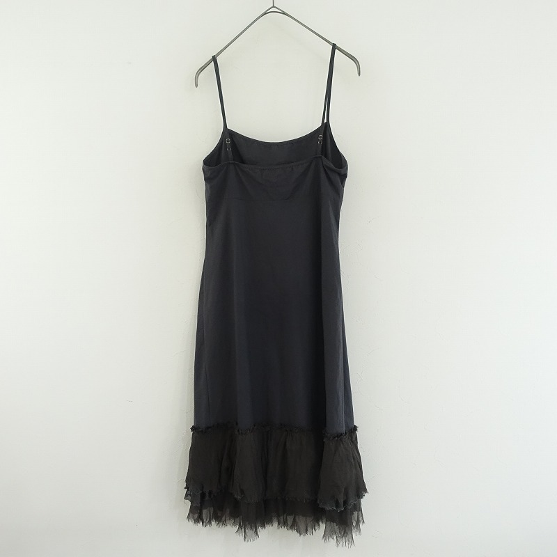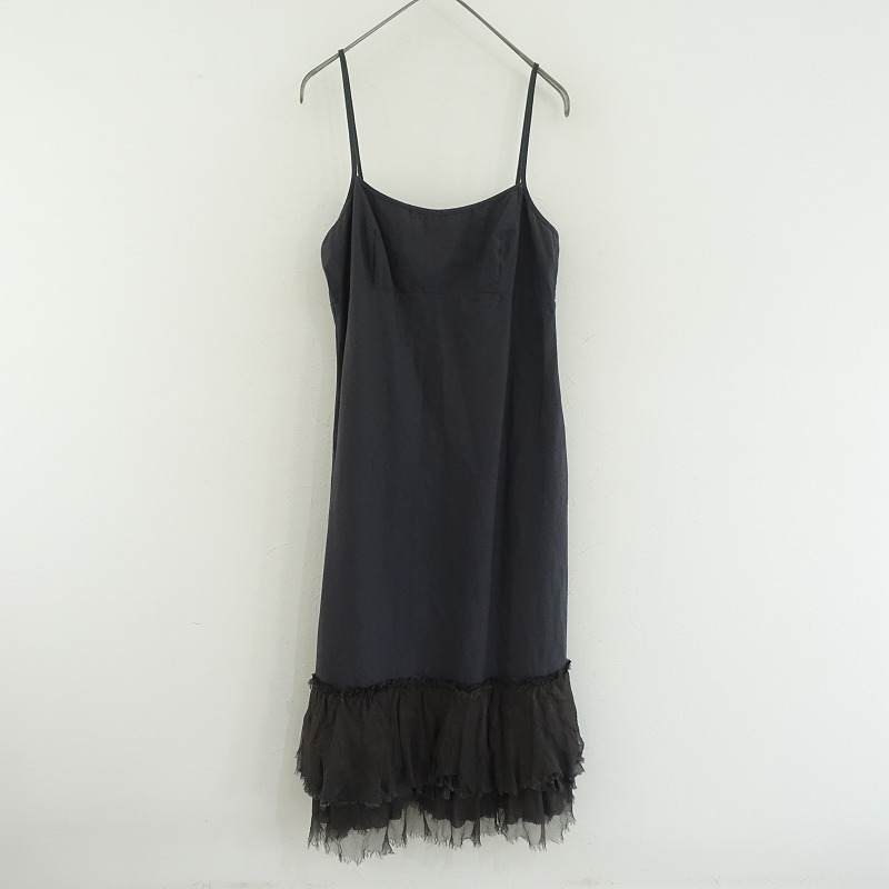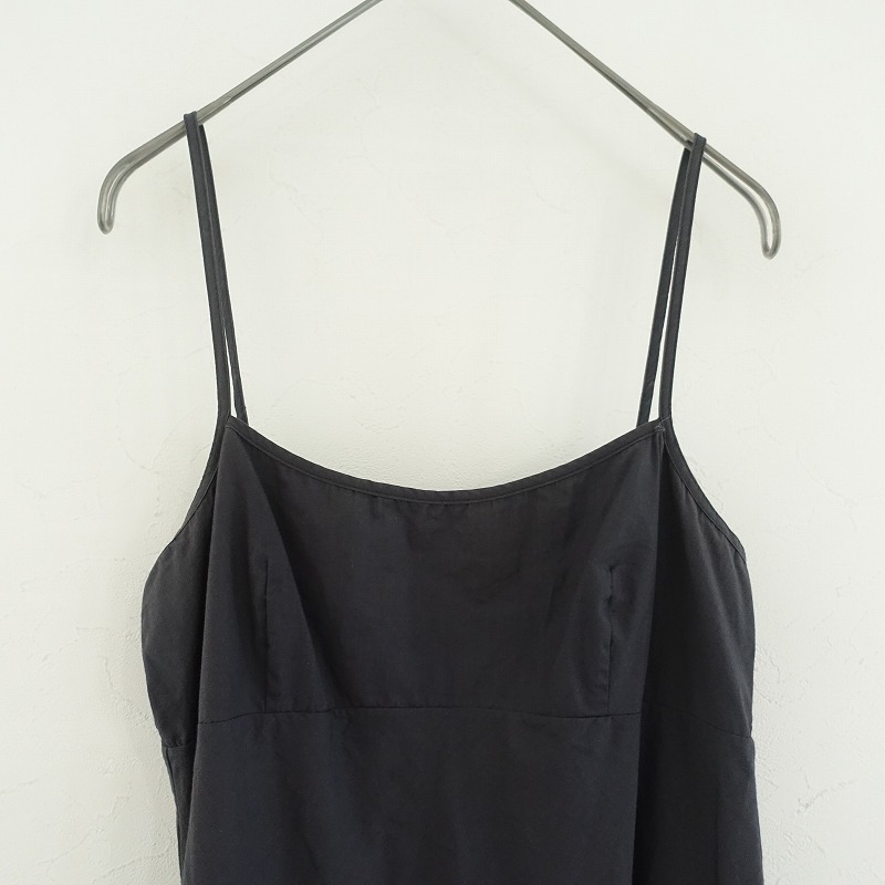 DOSAのオーガニックコットンslip w/ruffles キャミワンピースです。カラーはミッドナイトブルー×ブラックです。本体は密に織られたオーガニックコットン100%の布帛を使用。透け感はございません。肩紐は調節可能です。アンダーバストに切替えを配し、バストダーツ入り、裾には異素材の2枚を使い、3段のフリルが裁ち切りヘムであしらわれております。ポケットはございません。 |