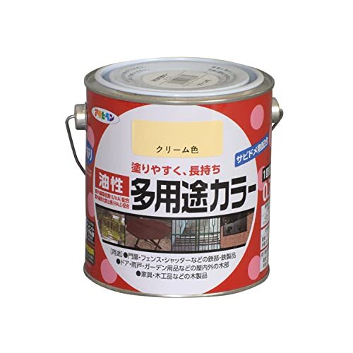「アサヒペン 塗料 ペンキ 油性多用途カラー 0.7L クリーム 油性 多用途 ツヤあり 1回塗り サビドメ剤配合 紫外線吸収剤配合 紫外線劣化防」▼4970925536662▼(商品説明)クリーム/0.7L/4970925536662・Color:クリームSize:0.7L・パッケージ個数:1・紫外線吸収剤(UVA)、紫外線劣化防止剤(HALS)配合により耐久性に優れた塗料です。・サビドメ剤を配合していますので、サビの発生を防ぎます。・タレにくいので大変塗りやすく、きれいに仕上がります。また、1回塗りで酸性雨・塩害・排気ガスに強い塗料です。・用途:(屋内外区分:屋内外用)門扉・フェンス・シャッターなどの鉄部・鉄製品。トタン(塗装されたトタン、密着性の悪いもの除く)。 ドア・雨戸・ガーデン用品などの屋内外の木部、家具・木工品などの木製品。・(標準)塗り回数:1回塗り光沢:ツヤあり/ツヤ消し 下処理方法:塗る面の汚れやワックスを取り除き、油分はペイントうすめ液でふき取ります。 やむを得ず残った塗料を捨てるときは、水性油性塗料兼用固化材で処理してください。 注意事項:絶えず水がかかったり水につかるところやいつも湿っているところ、また自動車、バイクの補修や床面、テーブル・カウンターの天面・座面には適しません。