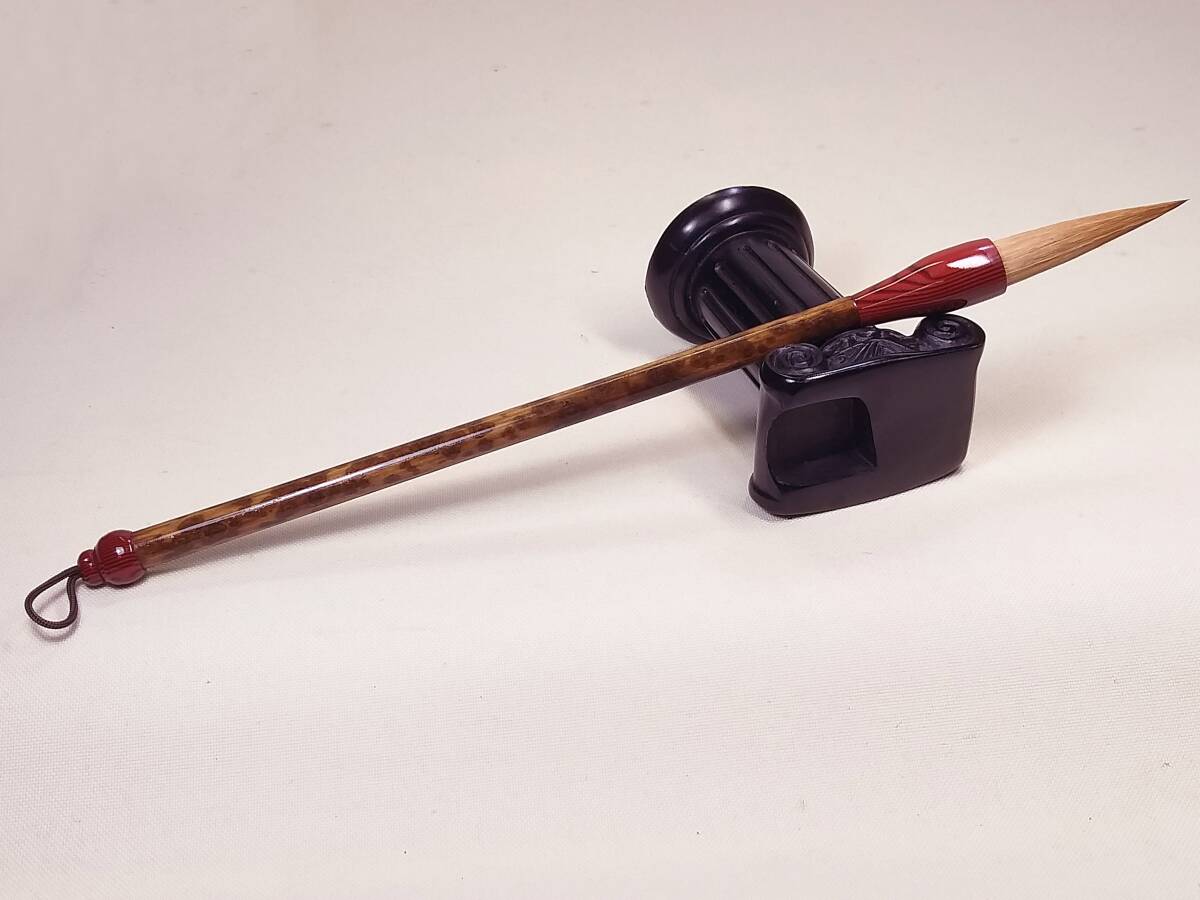 この品の筆軸に使用されている材料は、39数年前、産地にて直接購入した品です。35年以上に渡り乾燥された無垢材です。 本品に使用されている竹材の模様は、非常に綺麗です!これらの材料は、大変手に入り難くなっています。中国で現在、高級な毛筆、楽器製作のみに使用されています。中国毛筆制作の象牙、翡翠、玉石、唐木、骨類、竹類の六大類中、竹類の最高級の品種です!