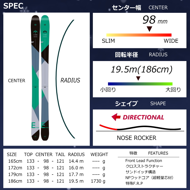 ET-9.8は整地からパウダースノーが積もった未圧雪エリアでも高いパフォーマンスを発揮。ワイドなシェイプながら整地のスムーズさも失わない汎用性の非常に高いオールマウンテンモデルです。