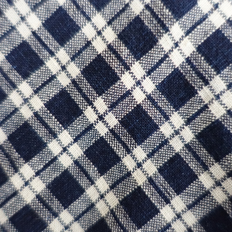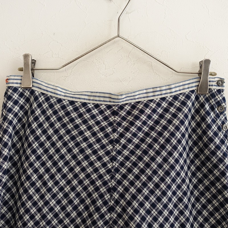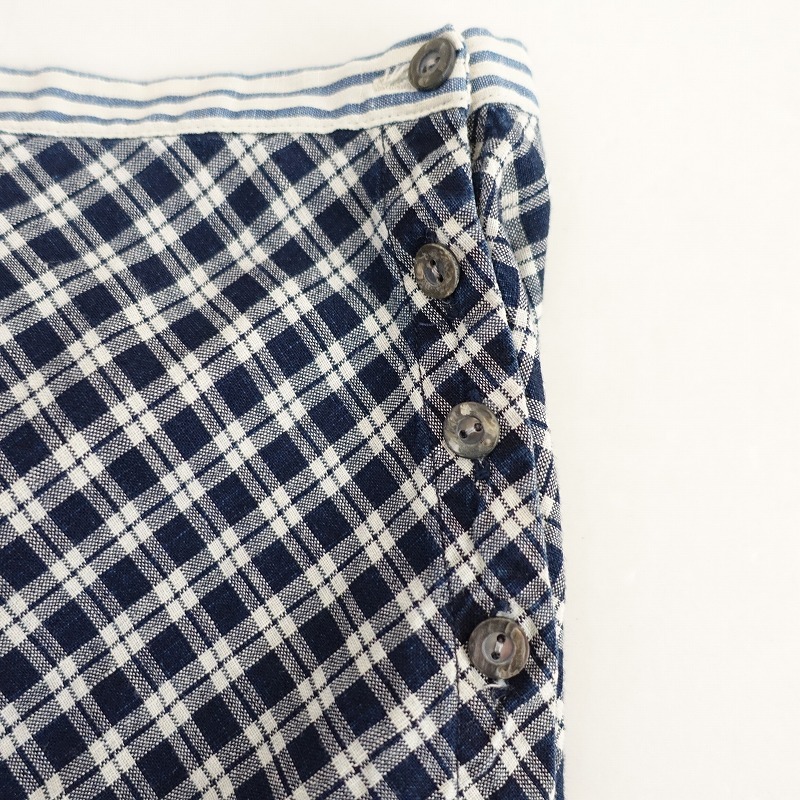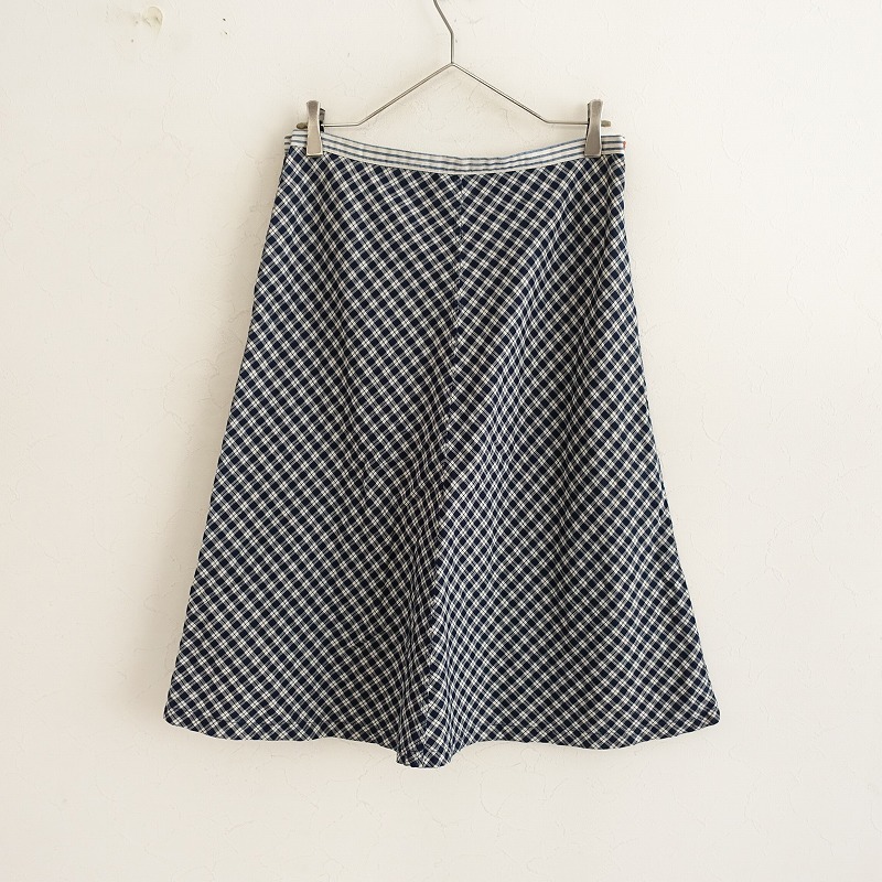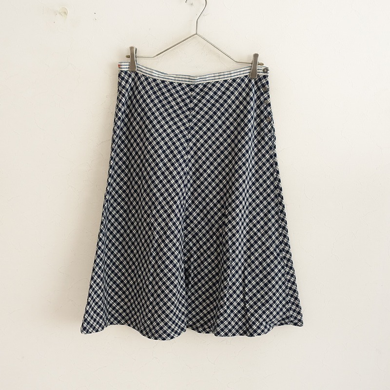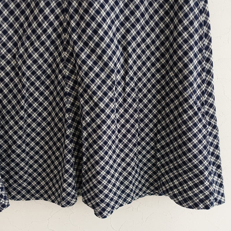 | R45RPMのコットンリネンチェック柄フレアスカートです。カラーはネイビー、ホワイトのチェック柄で、コットンリネン地で仕立てられています。左サイドのボタンで着脱でき、ウエストはボーダー地に切り替えられ、Rのワンポイント刺しゅう入りです。 |