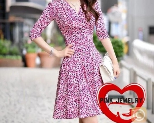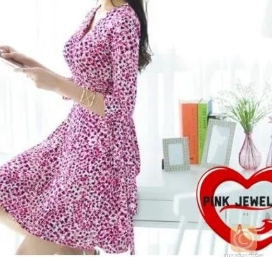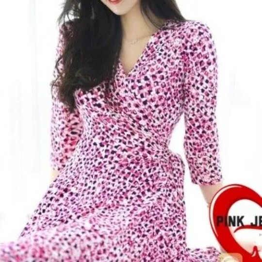 華やかな柄のピンクが可愛らしいラップワンピースです。