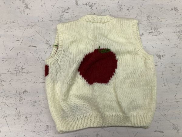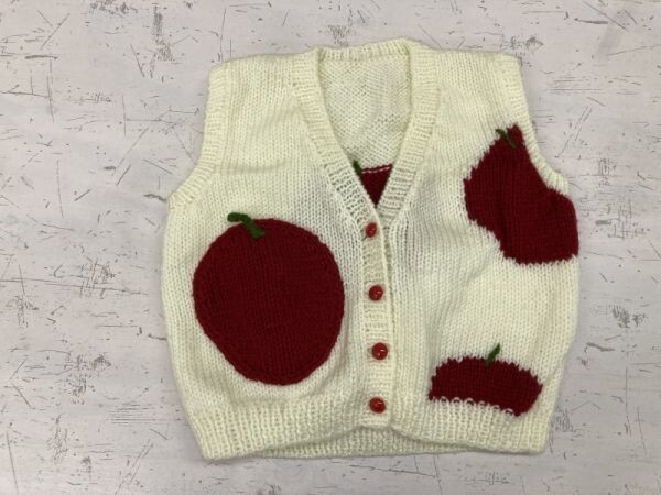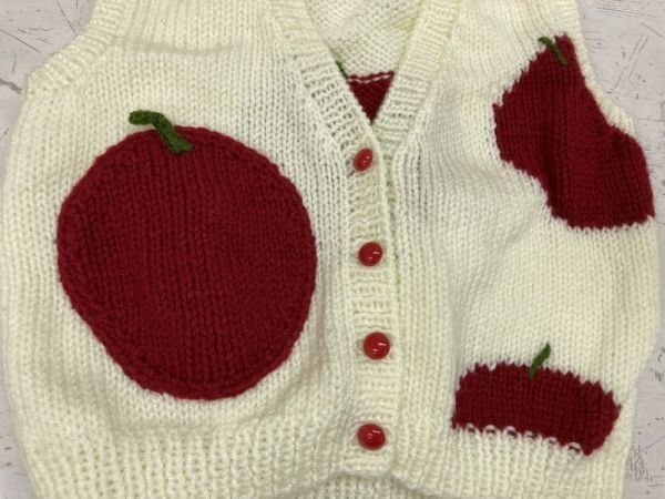 オールド レトロ りんご柄 ジャガード 子供服 キッズ 手編み ハンドメイド Vネック ハンドニット ボタン ベスト 白