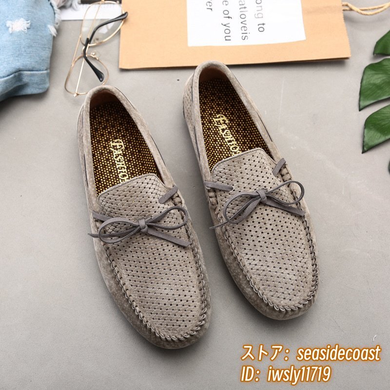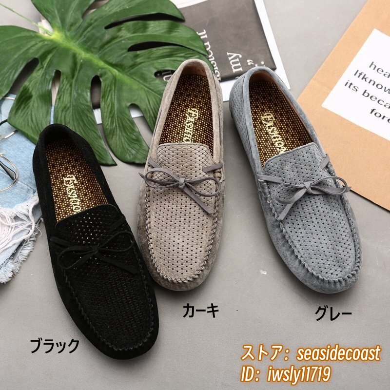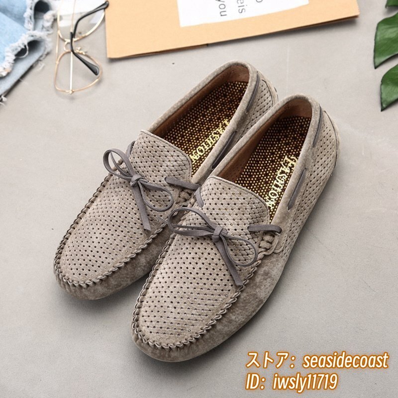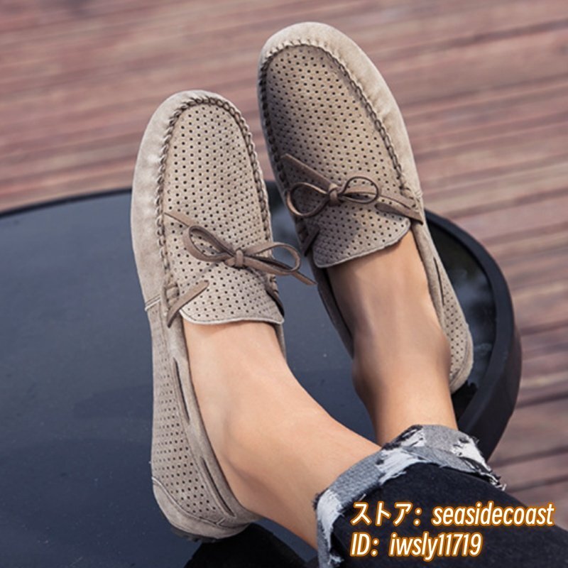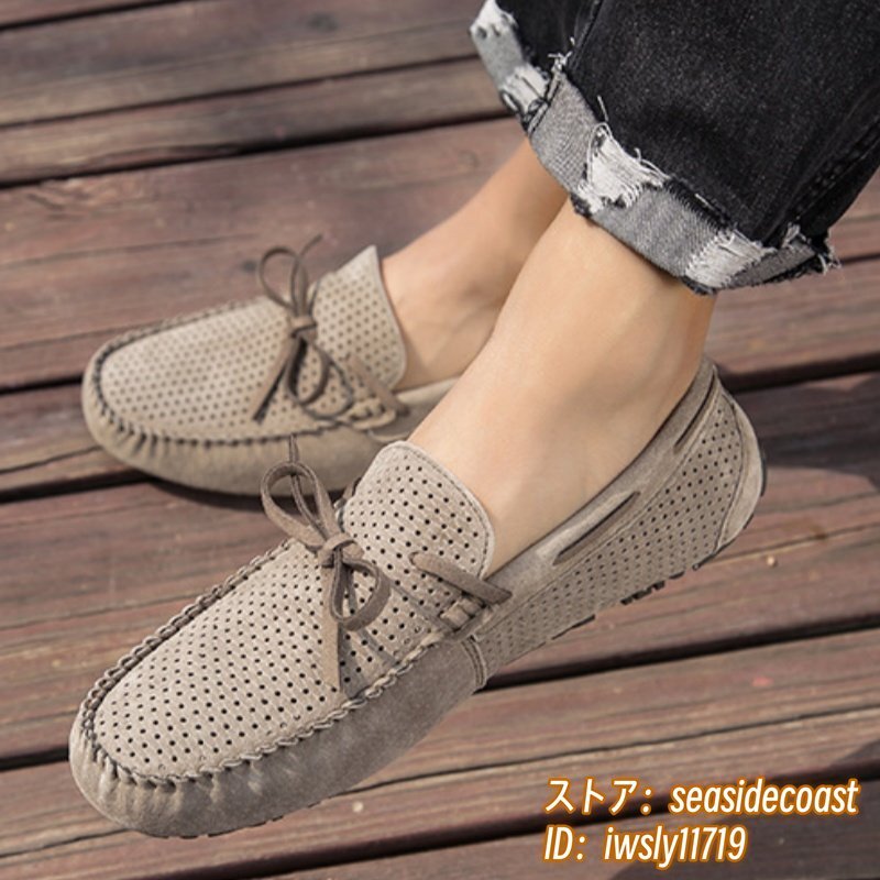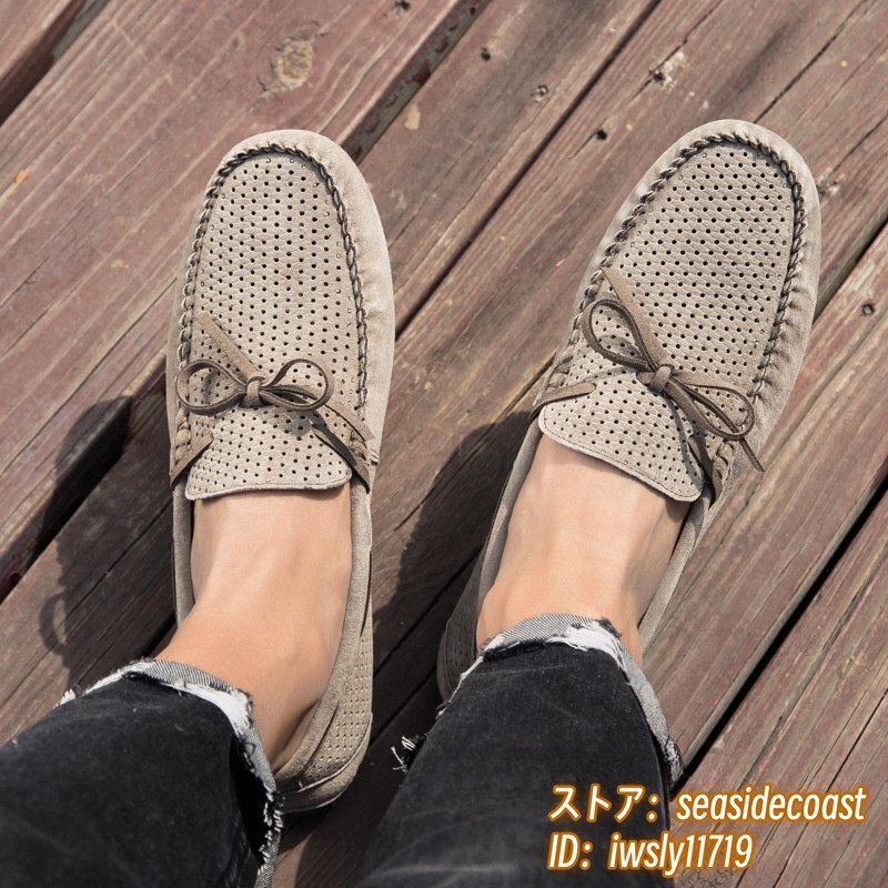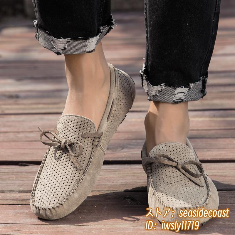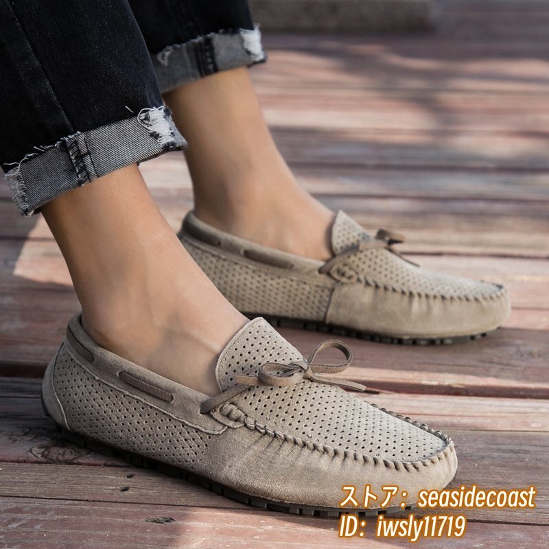夏新品 ローファー スリッポン 本革 ドライビングシューズ 牛革 メンズ レザーシューズ スエード革 透かし彫り メッシュ カーキ 25.5cm