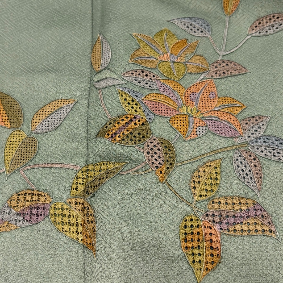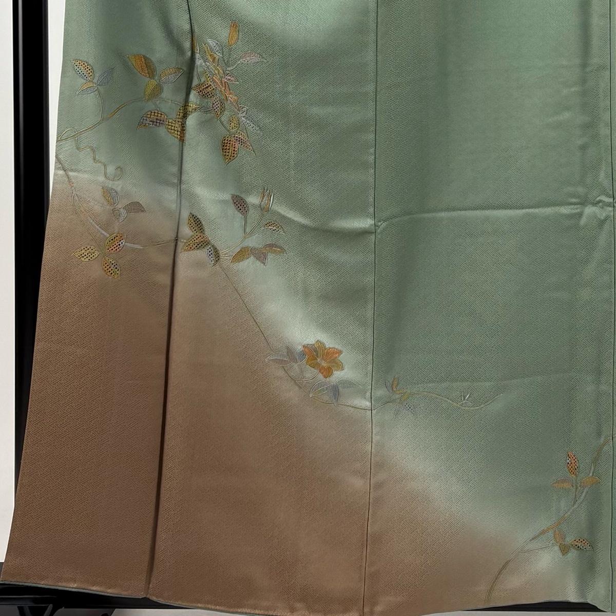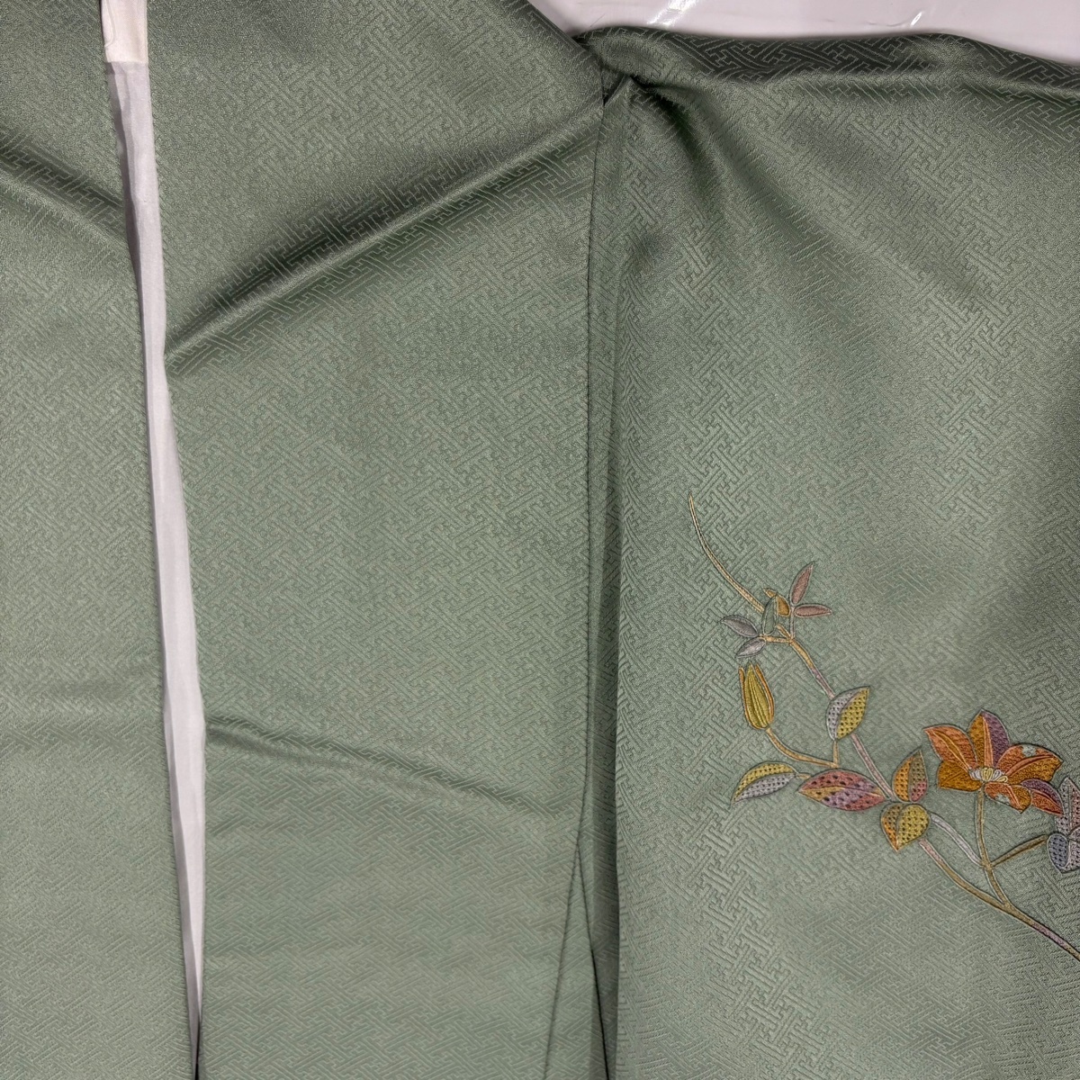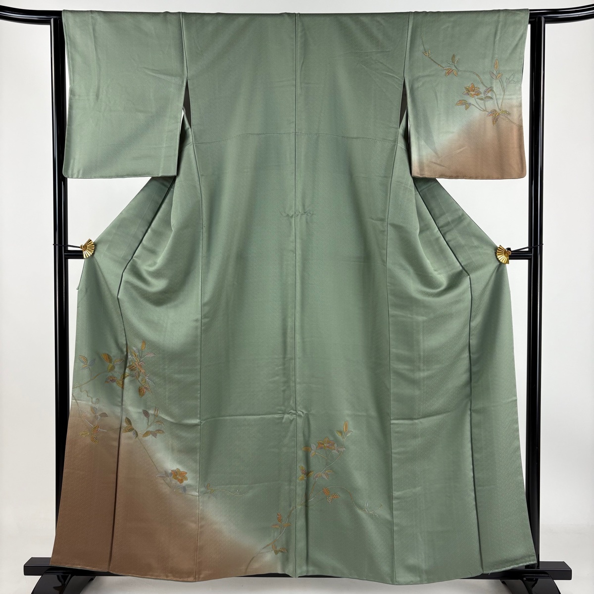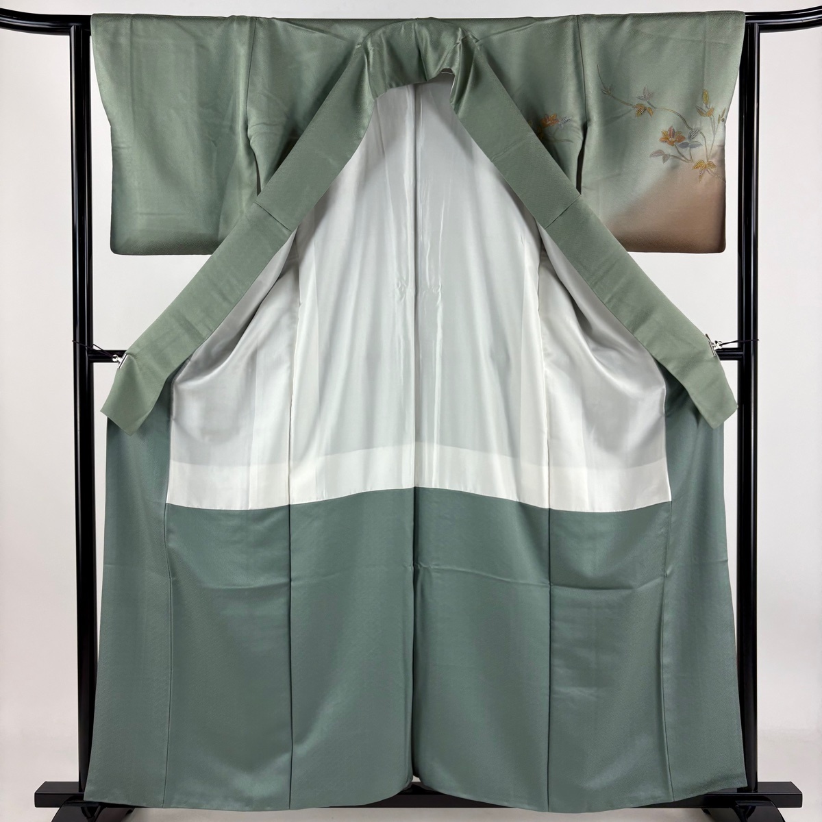 | 付下げ 名品 枝花 刺繍 染め分け 灰緑 袷 身丈159.5 裄丈64 M 正絹 【中古】 |