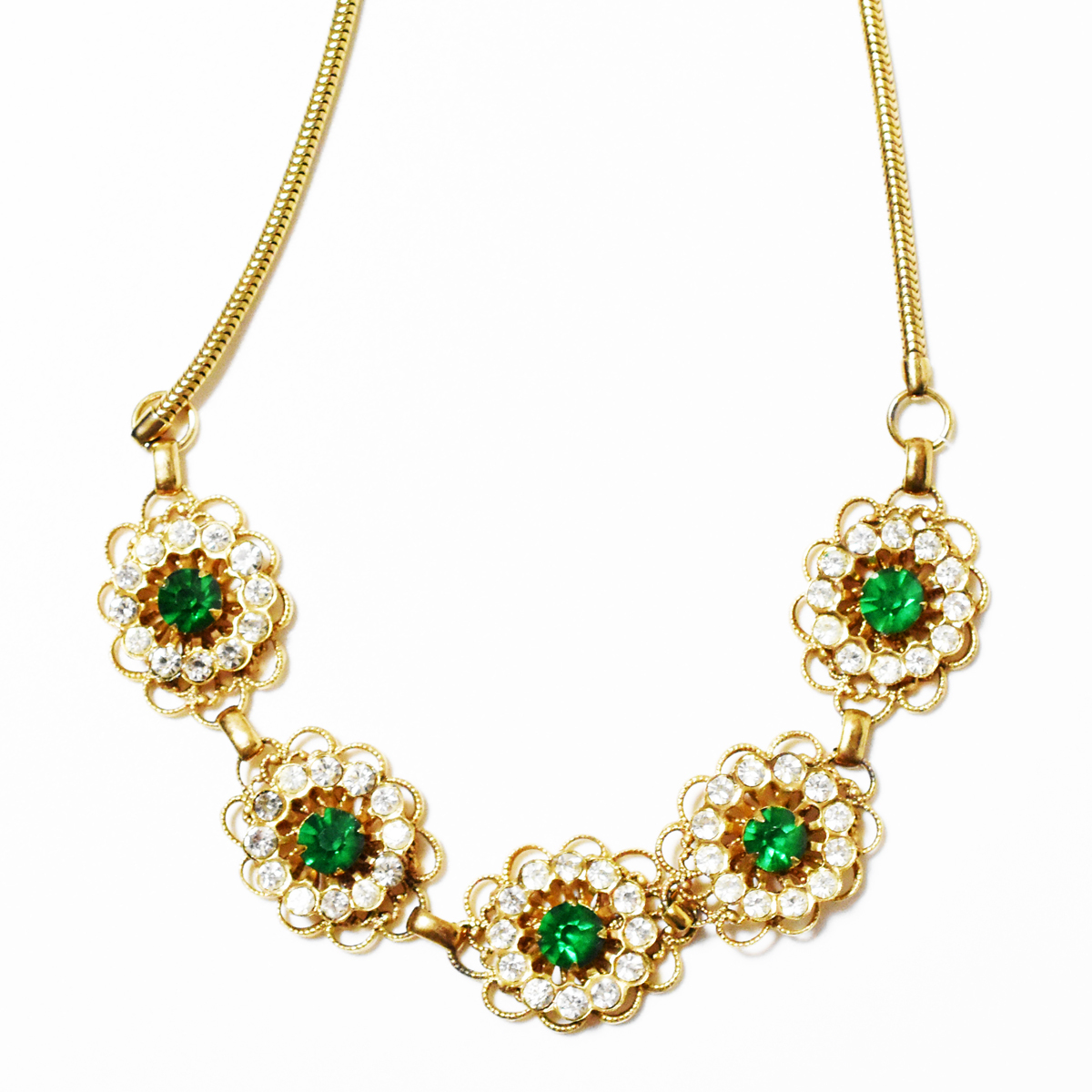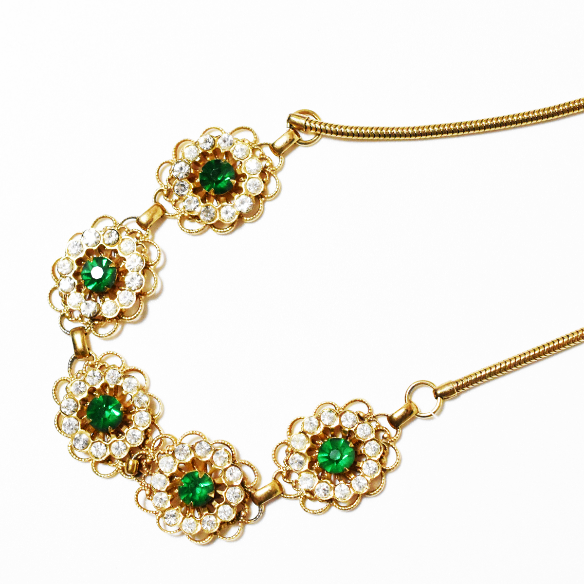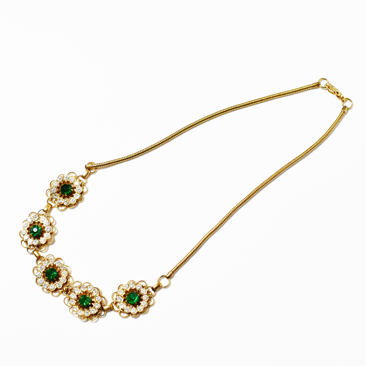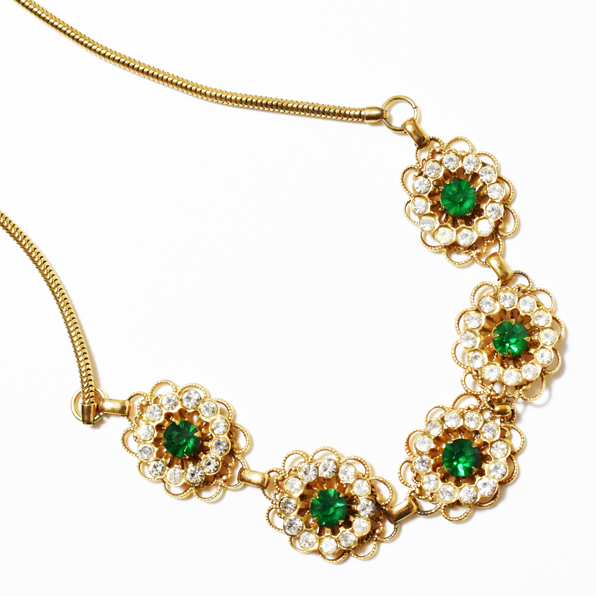 鮮やかなグリーンとクリアラインストーンが輝く美しいヴィンテージネックレス。